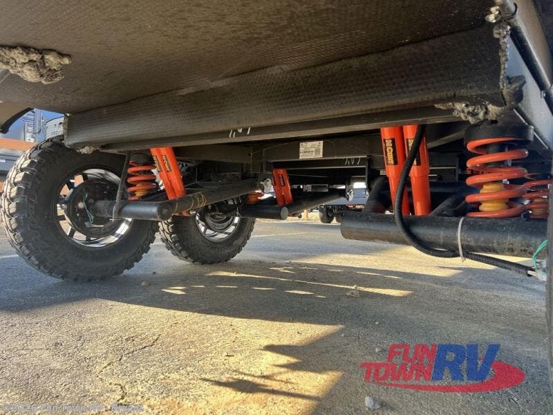 If you're looking for a couple's or solo travel trailer, this is the one! Once you arrive at the campground, you can unload the pass-thru storage, put out the 16' awning, and start lunch on the outside kitchen with a grill. The walk-thru bath is spacious and includes a spacious linen closet to keep dry towels close by. There is a theater seating slide out where you can relax each day, plus a bar top with two stools and a flip-up window for dining space. And the rear kitchen includes everything you need to cook meals when the weather isn't cooperating outside. When the optional Black Canyon Beast Mode Package is chosen on this model, you'll find an independent suspension, an additional 200-watt solar panel, totaling 400 watts of solar, a Maxxair vent cover and more!