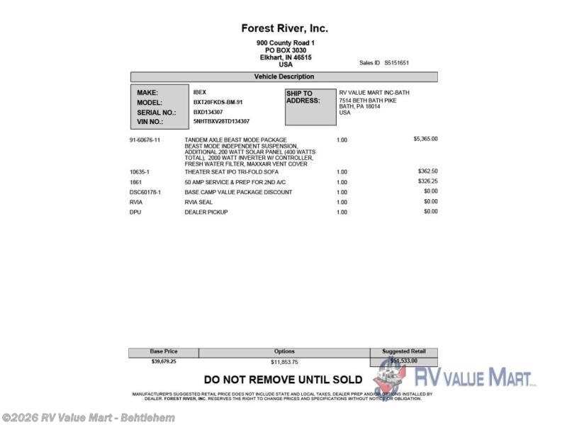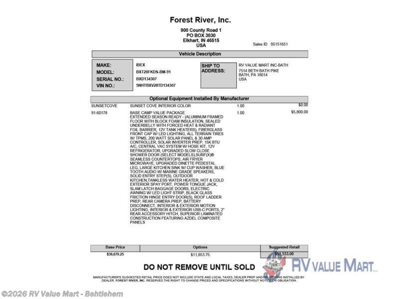 Request More Info on this 2026 Forest River IBEX 20FKDS-BM Offered for sale by RV Value Mart - Behtlehem
