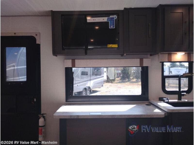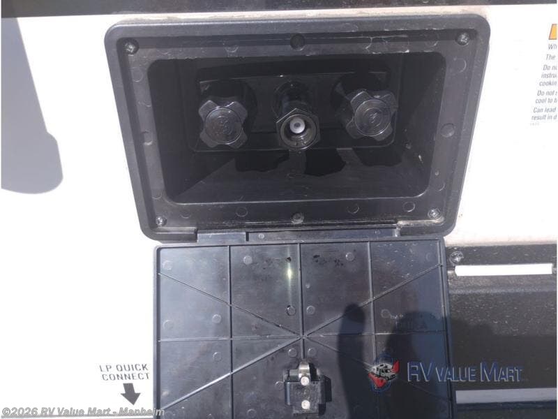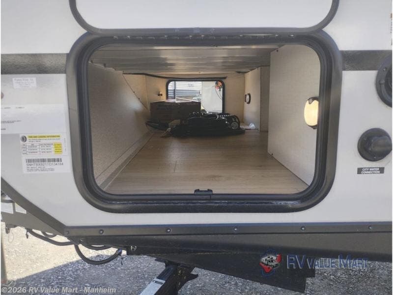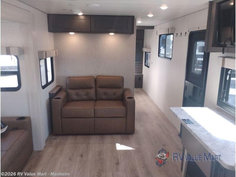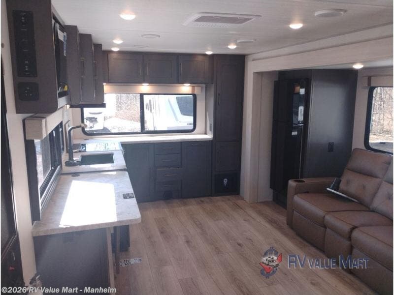 Pack your bags and head for the lake in this spacious travel trailer! Once you've set up camp, you can unload the slam latch cargo doors with pass-thru lighting, then start lunch on the outside kitchen. If you don't want to eat outdoors, there is a Bar 2 Table pull-out dinette table, theater seating, and a tri-fold sofa for ample seating spaces. The flip-up window in front of the dinette will give you a great view as you enjoy your coffee each morning, and the full bath onboard will let you freshen up after a day of hiking. This unit also includes a rear kitchen with ample counter space, plus a front private bedroom, complete with a queen bed, dual wardrobes, and washer/dryer prep!