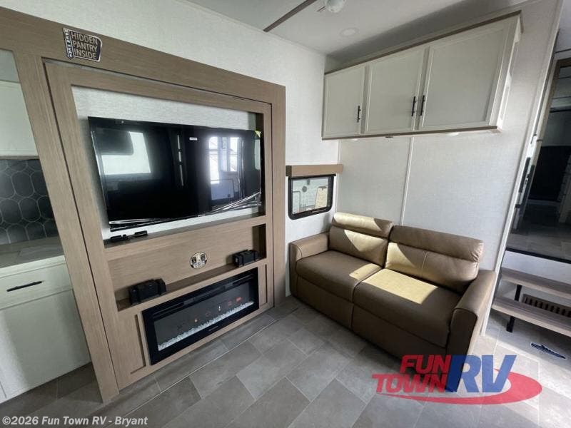 With this 301ML model, the main living area of this travel trailer is truly the heart of the home, featuring a spacious table and chairs perfect for gathering around during dinner or enjoying a fun board game, all while watching TV with hidden storage behind it to keep your essentials and snacks neatly tucked away. For added comfort, there’s a versatile trifold sofa that doubles as extra sleeping space, or you can relax in the cozy recliners and kick your feet up. Next to the recliners is a convenient desk, ideal for studying or working from home. The full rear kitchen is fully equipped with modern conveniences, including a dishwasher and a spacious 16-cubic-foot refrigerator. Moving toward the center, you’ll find a full bathroom with a walk-in shower and skylight, while the front of the trailer boasts a private bedroom complete with a king bed featuring Versa Tilt technology, a dresser, bench, and wardrobe to ensure maximum comfort and storage.