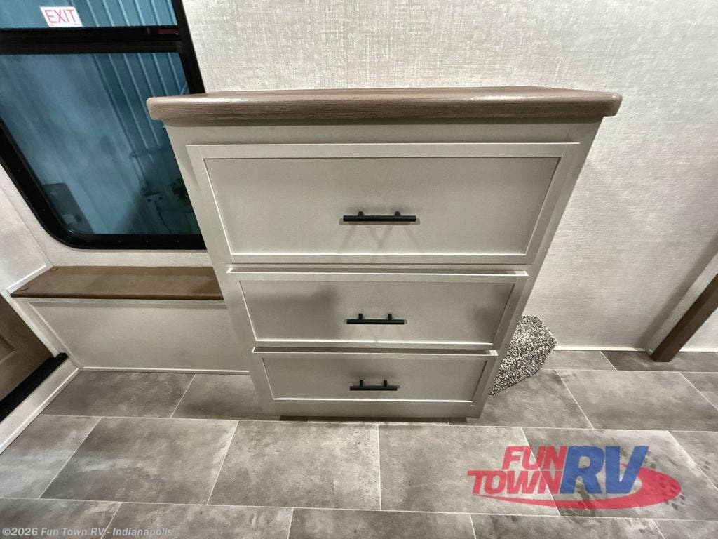 With this 301ML model, the main living area of this travel trailer is truly the heart of the home, featuring a spacious table and chairs perfect for gathering around during dinner or enjoying a fun board game, all while watching TV with hidden storage behind it to keep your essentials and snacks neatly tucked away. For added comfort, there’s a versatile trifold sofa that doubles as extra sleeping space, or you can relax in the cozy recliners and kick your feet up. Next to the recliners is a convenient desk, ideal for studying or working from home. The full rear kitchen is fully equipped with modern conveniences, including a dishwasher and a spacious 16-cubic-foot refrigerator. Moving toward the center, you’ll find a full bathroom with a walk-in shower and skylight, while the front of the trailer boasts a private bedroom complete with a king bed featuring Versa Tilt technology, a dresser, bench, and wardrobe to ensure maximum comfort and storage.