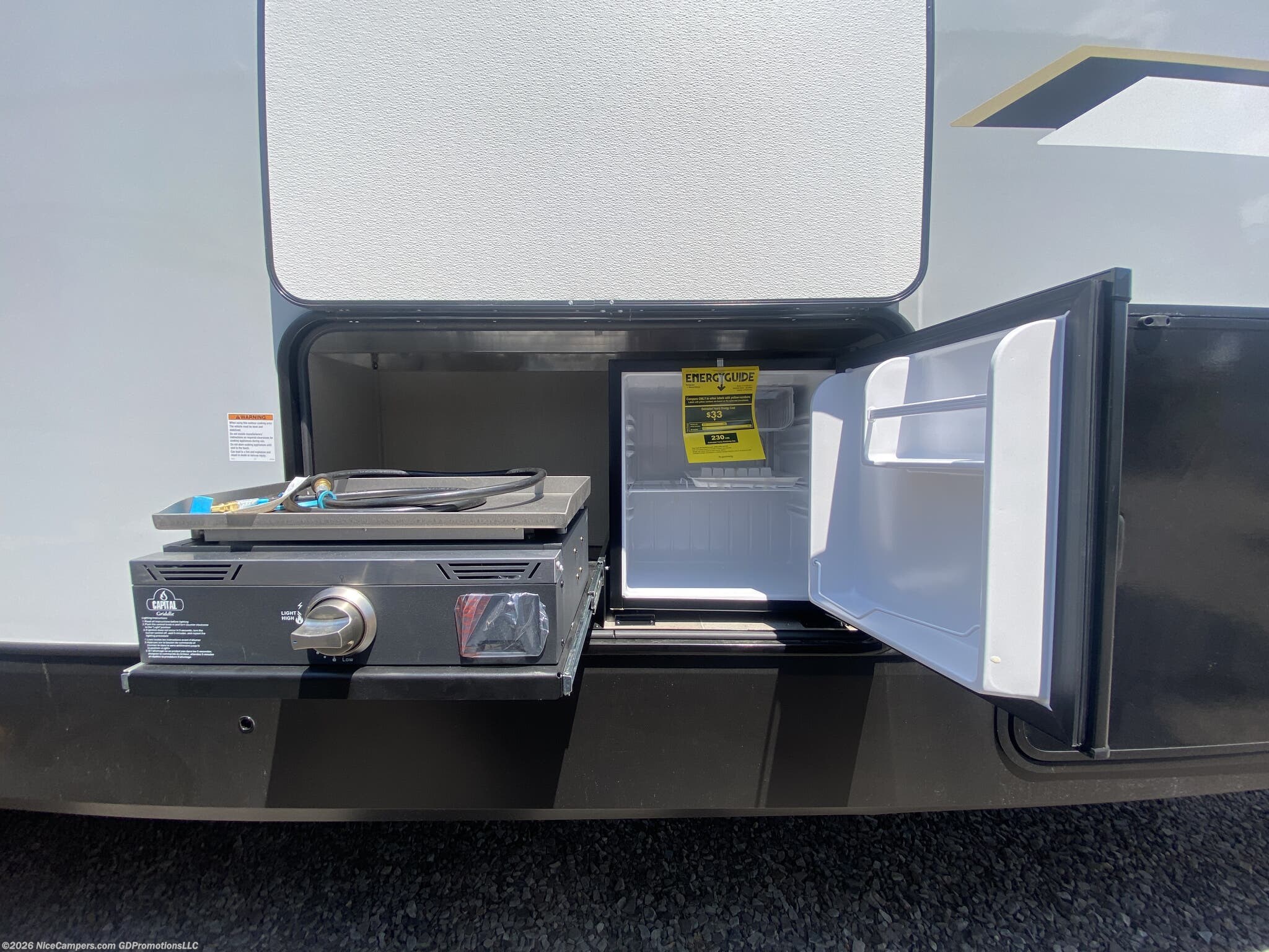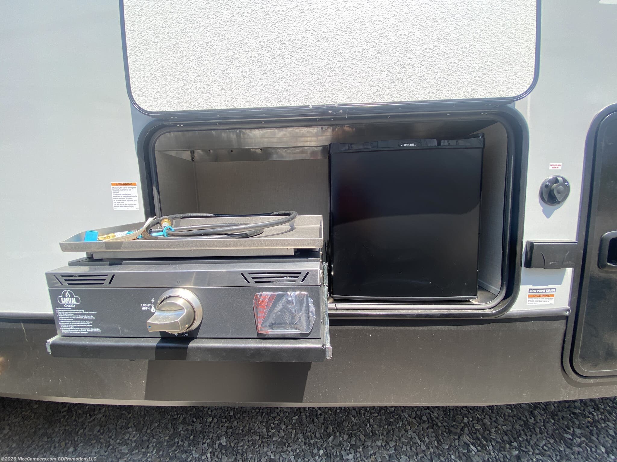 Awning, Exterior Speakers, External Shower, Hitch, Ladder, Leveling Jacks, Outside Kitchen, Skylight, Slideout, Spare Tire Kit -