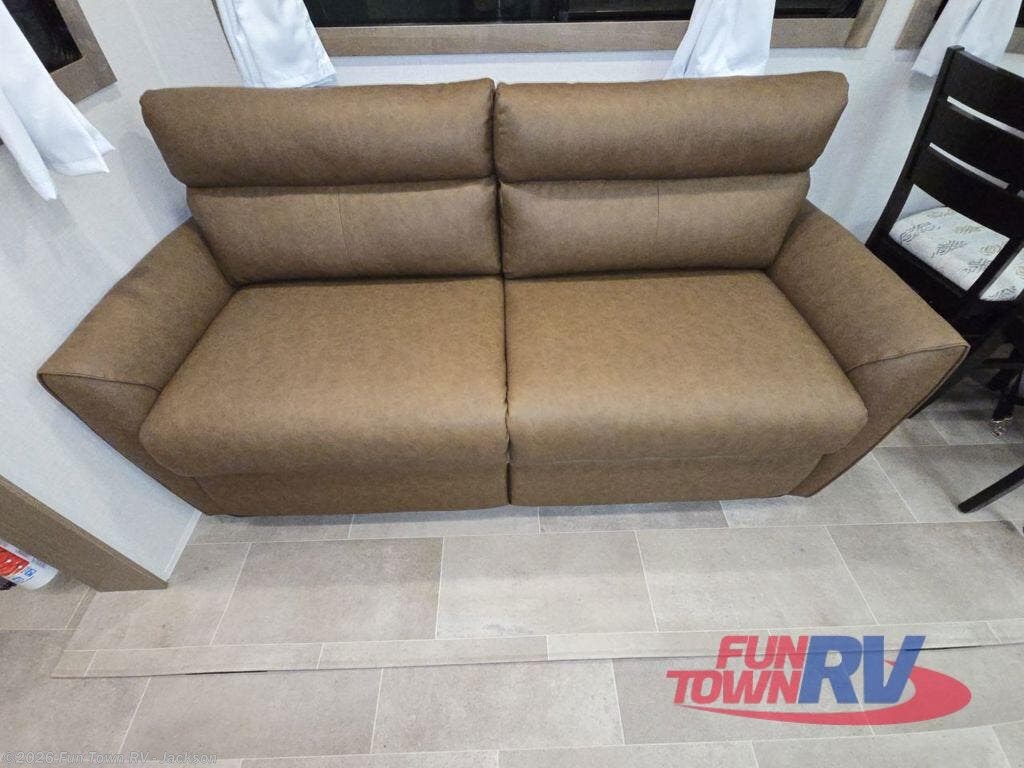Wow! This fifth wheel will surely make an impression with its middle bunkhouse that can be utilized as an extra bedroom, second living room or even an office thanks to the desk and sofa that becomes a Versa queen bed at night. You will also find a flip-down upper bunk, a slide out for more floor space, and a wardrobe for clothing. The full bathroom is between this room and the front bedroom that offers lots of storage including a slide out wardrobe, a space prepped for a washer/dryer option, nightstands to place your cellphone and such, plus a queen bed with Versa Tilt technology. The kitchen at the back includes plenty of storage for your dishes, pans, drinkware, and dry goods. The cook will love the kitchen island and the full amenities. And the free-standing table with chairs plus the theater seating offer even more seating.