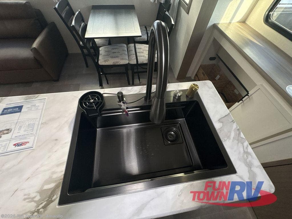 Wow! This fifth wheel will surely make an impression with its middle bunkhouse that can be utilized as an extra bedroom, second living room or even an office thanks to the desk and sofa that becomes a Versa queen bed at night. You will also find a flip-down upper bunk, a slide out for more floor space, and a wardrobe for clothing. The full bathroom is between this room and the front bedroom that offers lots of storage including a slide out wardrobe, a space prepped for a washer/dryer option, nightstands to place your cellphone and such, plus a queen bed with Versa Tilt technology. The kitchen at the back includes plenty of storage for your dishes, pans, drinkware, and dry goods. The cook will love the kitchen island and the full amenities. And the free-standing table with chairs plus the theater seating offer even more seating.