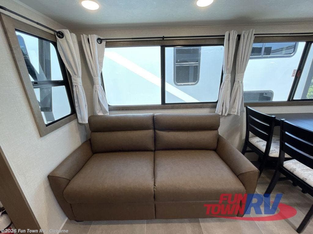 Wow! This fifth wheel will surely make an impression with its middle bunkhouse that can be utilized as an extra bedroom, second living room or even an office thanks to the desk and sofa that becomes a Versa queen bed at night. You will also find a flip-down upper bunk, a slide out for more floor space, and a wardrobe for clothing. The full bathroom is between this room and the front bedroom that offers lots of storage including a slide out wardrobe, a space prepped for a washer/dryer option, nightstands to place your cellphone and such, plus a queen bed with Versa Tilt technology. The rear kitchen includes plenty of storage for your dishes, pans, drinkware, and dry goods. The cook will love the kitchen island, the full amenities as well as the choice to use the outside kitchen to help feed everyone. And the free standing dinette with chairs plus the so a theater seating offer seating inside.