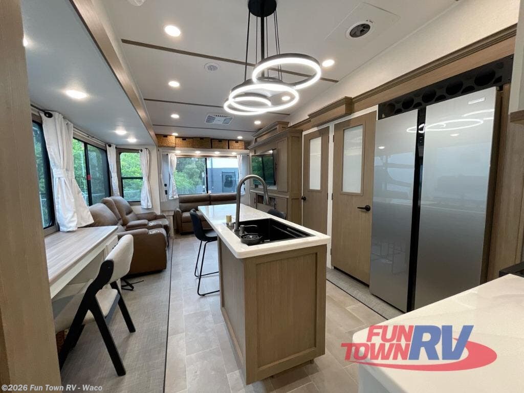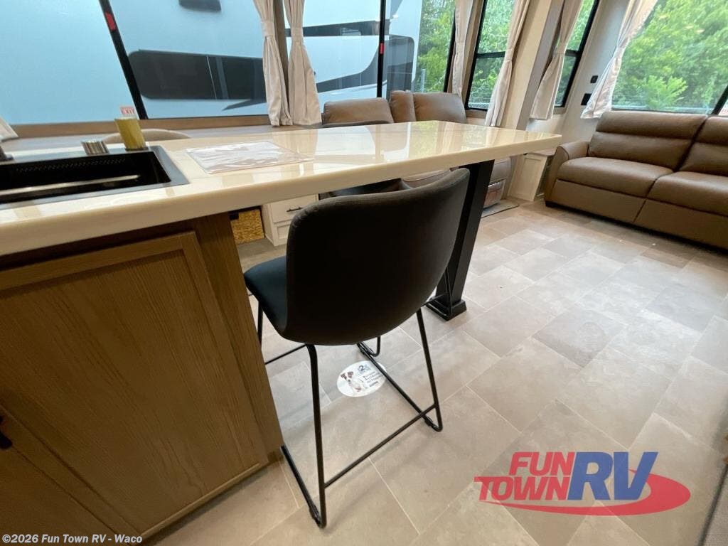 Step inside this luxurious fifth wheel that can sleep five each night! The rear tri-fold hide-a-bed sofa and theater seating provide a relaxing evening by the entertainment center with a 55" TV. Next to the entertainment center is a hidden door with cabinets and 16 cu. ft. 12V refrigerator, and a 36" x 74" flip-down bunk with storage. The kitchen has plenty of countertop space to prepare your best home cooked meals and an island with four bar stools to enjoy your meals. You also have a desk with storage to get some work done if needed. As you walk up the floating steps, you will notice the full bathroom to your left with a walk-in shower with a skylight for added natural lighting and a dual sink vanity for two to get ready at once. The front private bedroom has a king bed with Versa Tilt technology slide, a dresser next to a bench and a front wardrobe that is prepped for a washer and dryer!