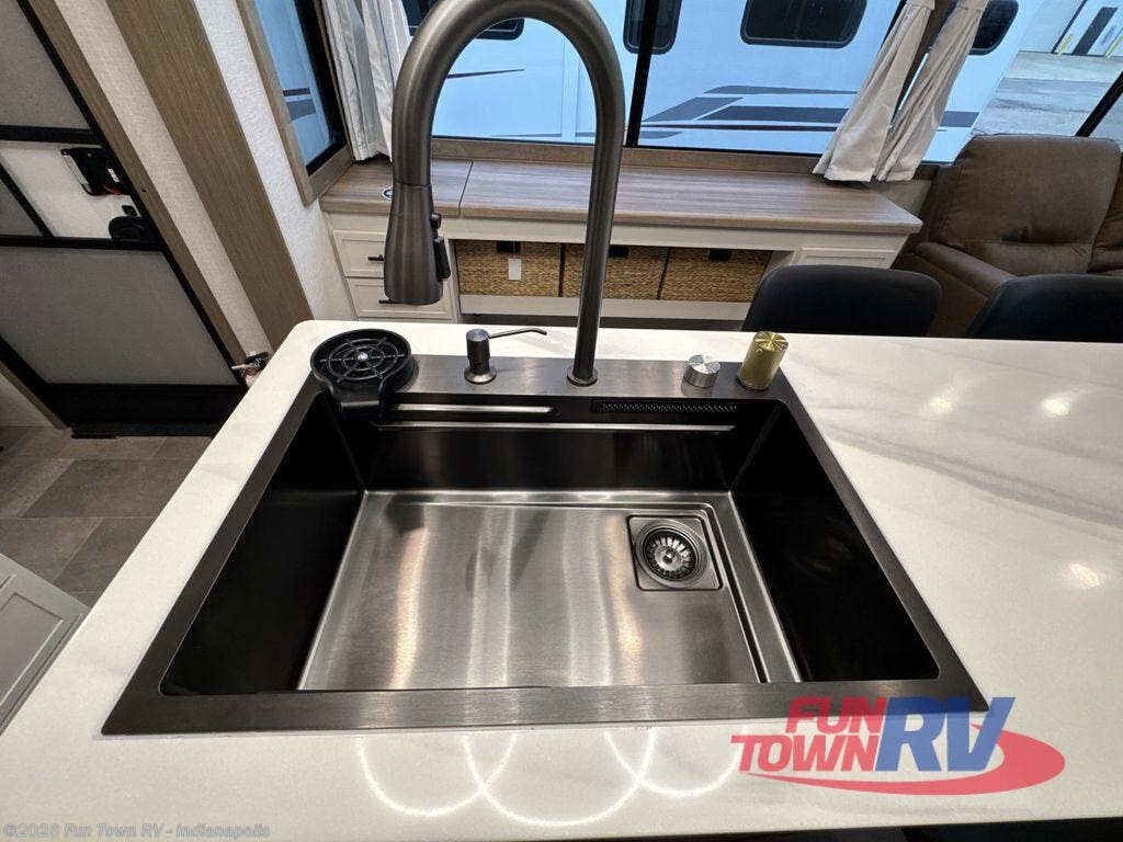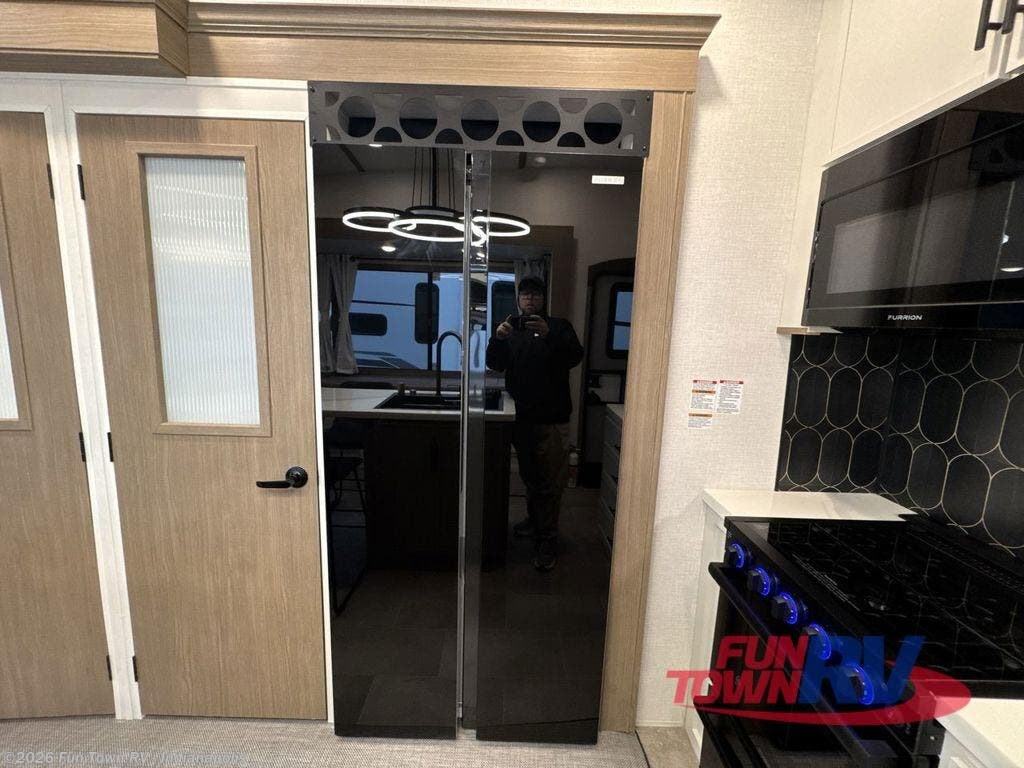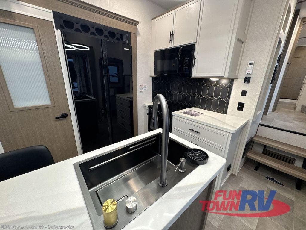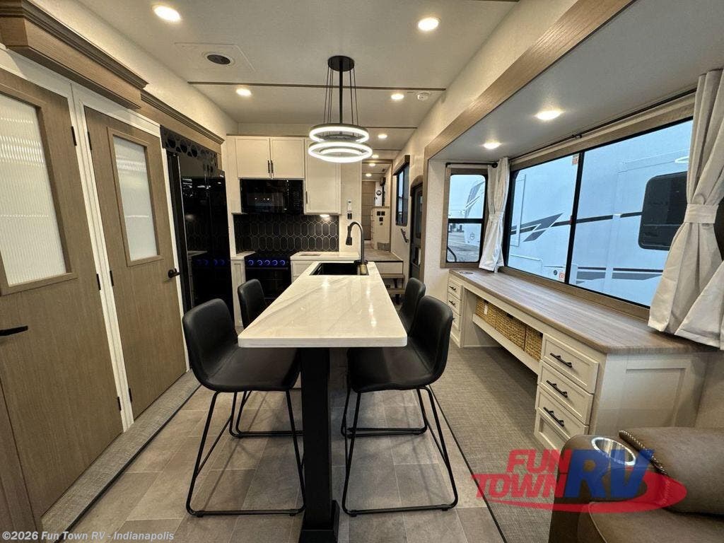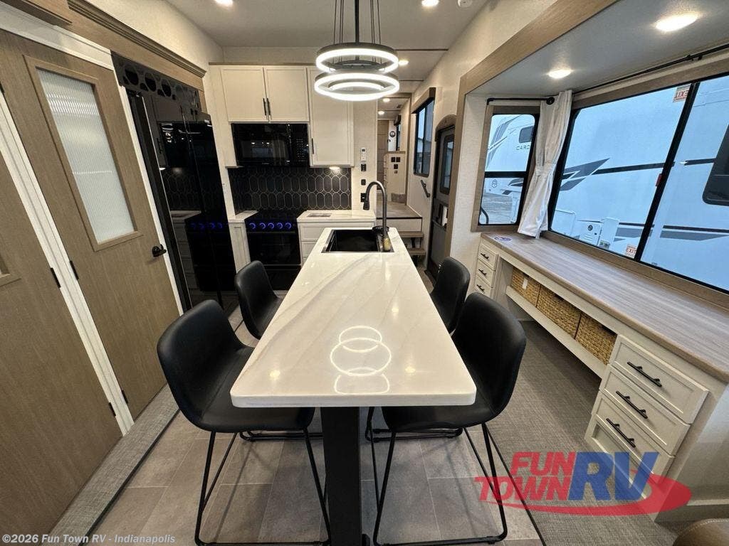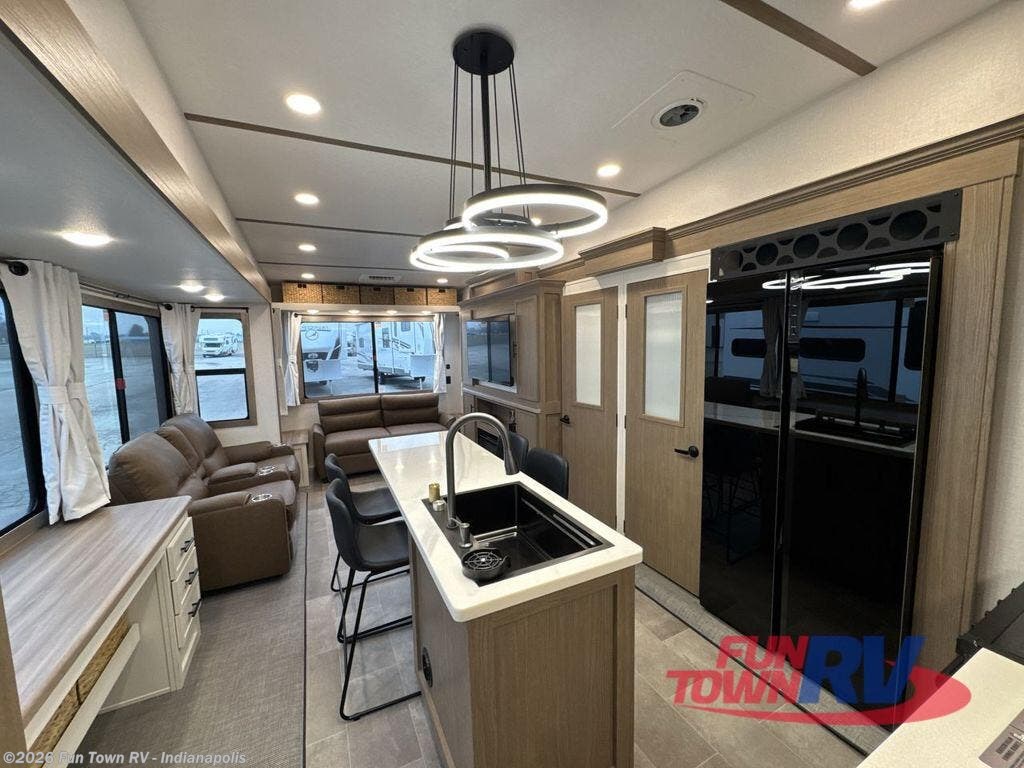 Step inside this luxurious fifth wheel that can sleep five each night! The rear tri-fold hide-a-bed sofa and theater seating provide a relaxing evening by the entertainment center with a 55" TV. Next to the entertainment center is a hidden door with cabinets and 16 cu. ft. 12V refrigerator, and a 36" x 74" flip-down bunk with storage. The kitchen has plenty of countertop space to prepare your best home cooked meals and an island with four bar stools to enjoy your meals. You also have a desk with storage to get some work done if needed. As you walk up the floating steps, you will notice the full bathroom to your left with a walk-in shower with a skylight for added natural lighting and a dual sink vanity for two to get ready at once. The front private bedroom has a king bed with Versa Tilt technology slide, a dresser next to a bench and a front wardrobe that is prepped for a washer and dryer!