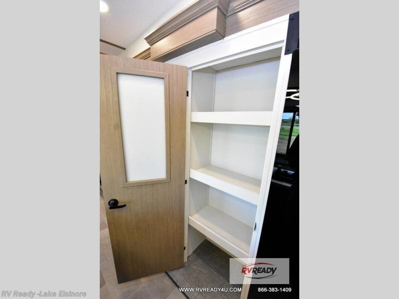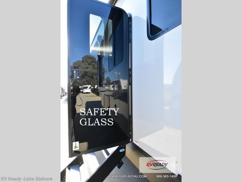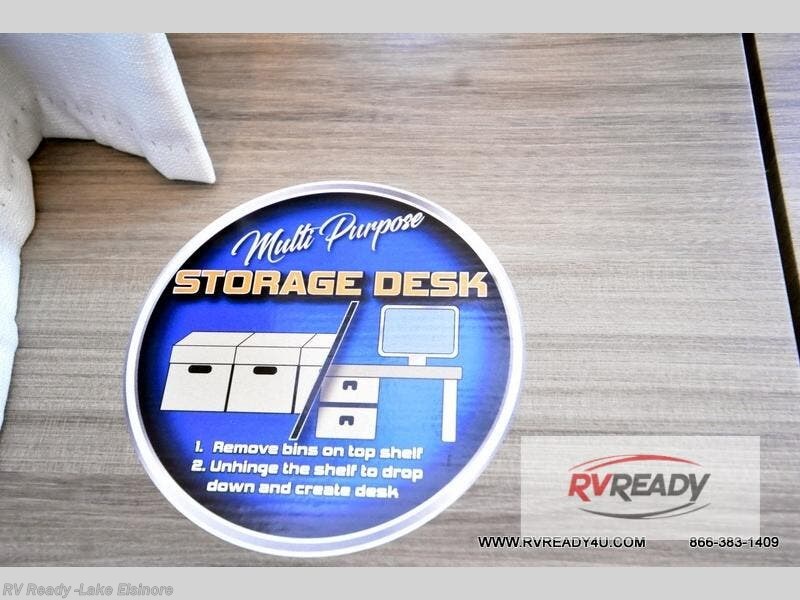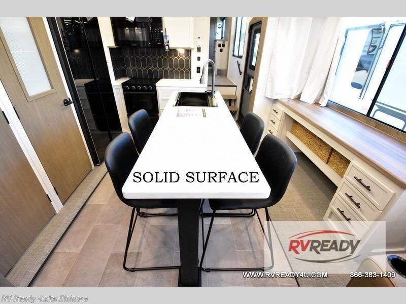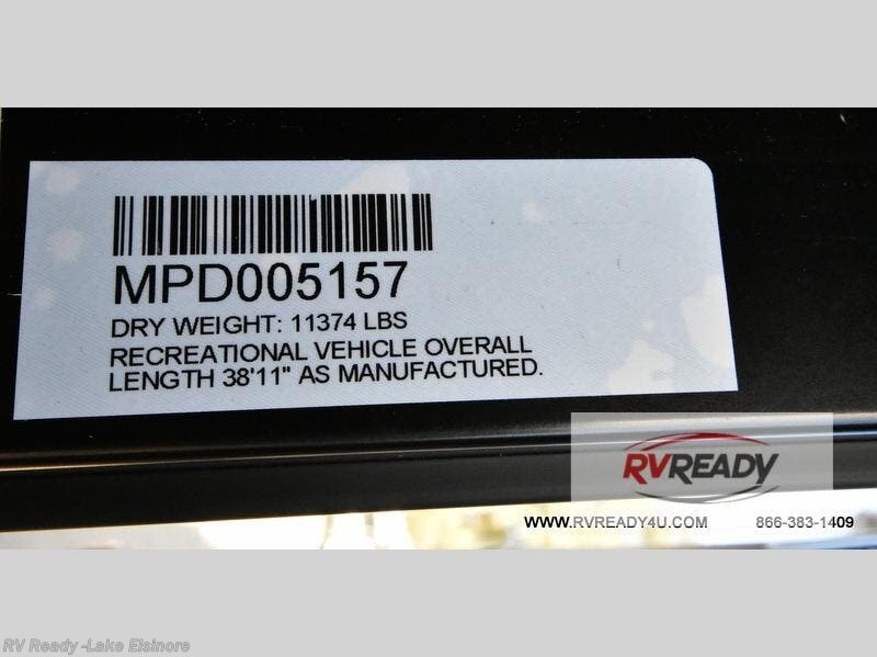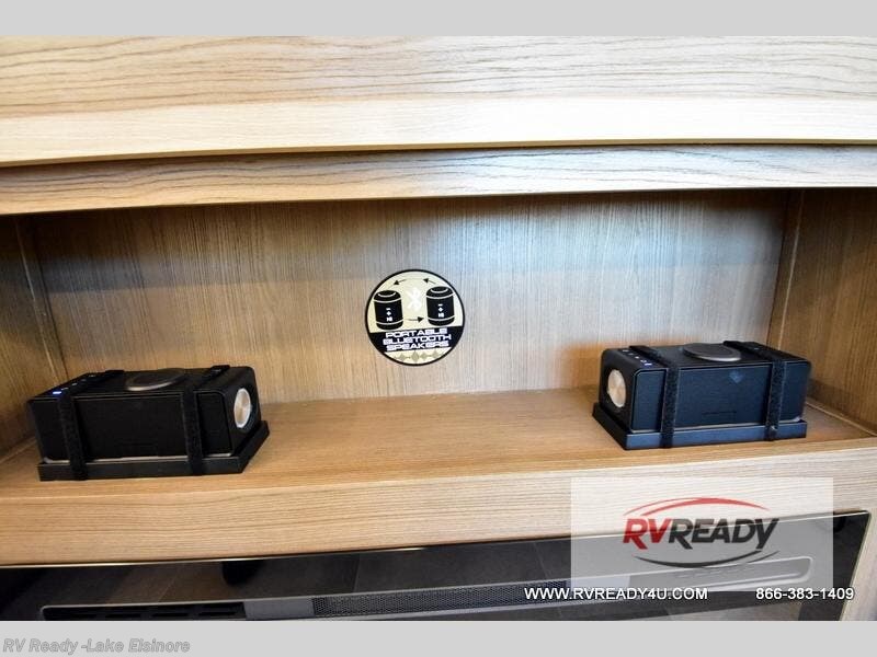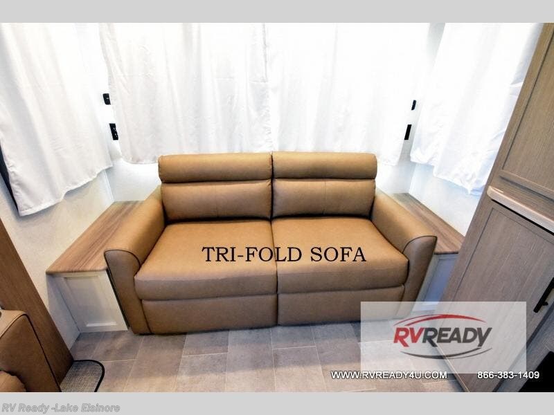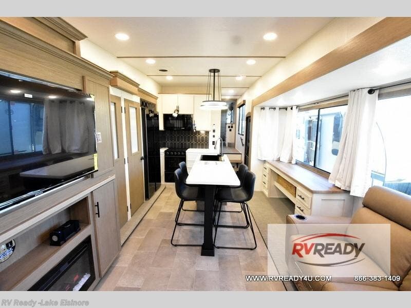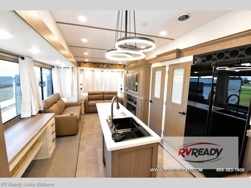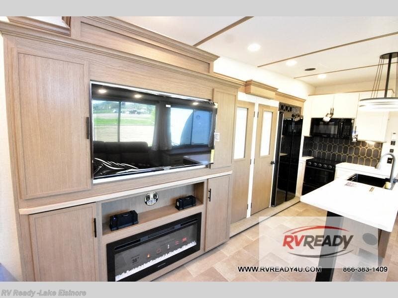 Step inside this luxurious fifth wheel that can sleep the whole gang each night! The rear tri-fold hide-a-bed sofa and theater seating provide a relaxing evening by the entertainment center with a TV. Next to the entertainment center is a hidden door with cabinets and 16 cu. ft. 12V refrigerator, and a 36" x 74" flip-down bunk with storage. The kitchen has plenty of countertop space to prepare your best home cooked meals and an island with four bar stools to enjoy your meals. You also have a desk with storage to get some work done if needed. As you walk up the floating steps, you will notice the full bathroom to your left with a walk-in shower with a skylight for added natural lighting and a dual sink vanity for two to get ready at once. The front private bedroom has a king bed with Versa Tilt technology slide, a dresser next to a bench and a front wardrobe that is prepped for a washer and dryer!