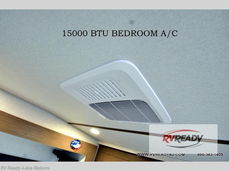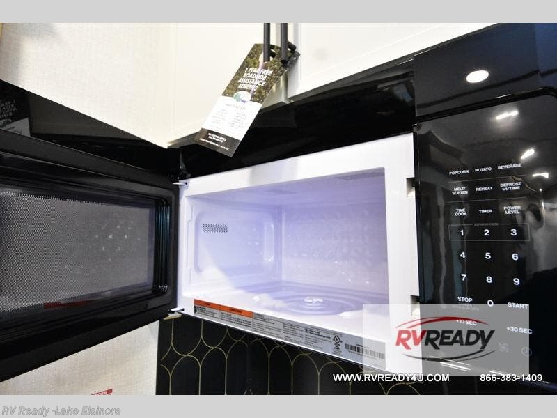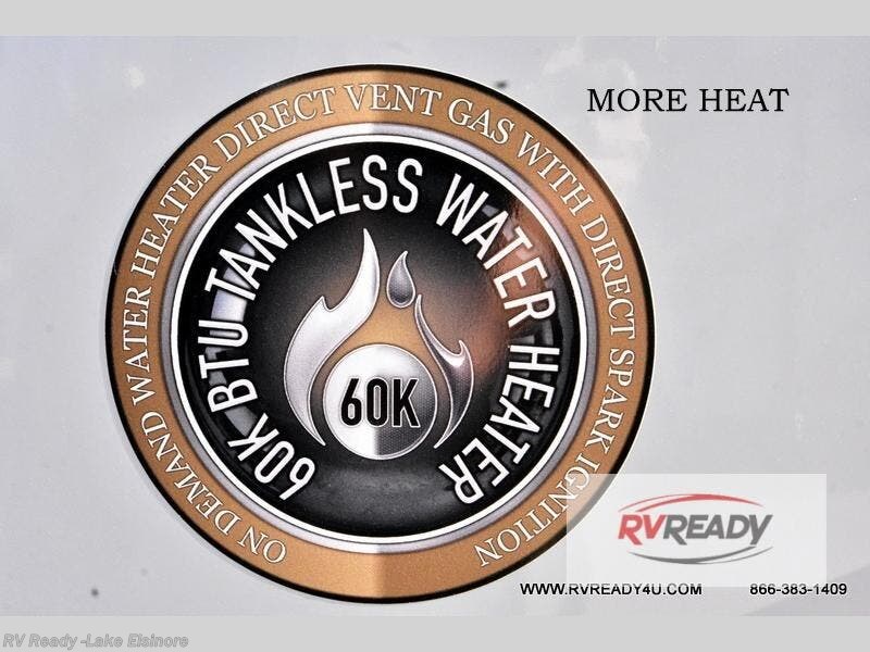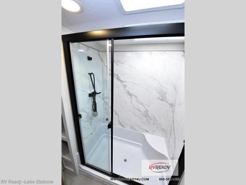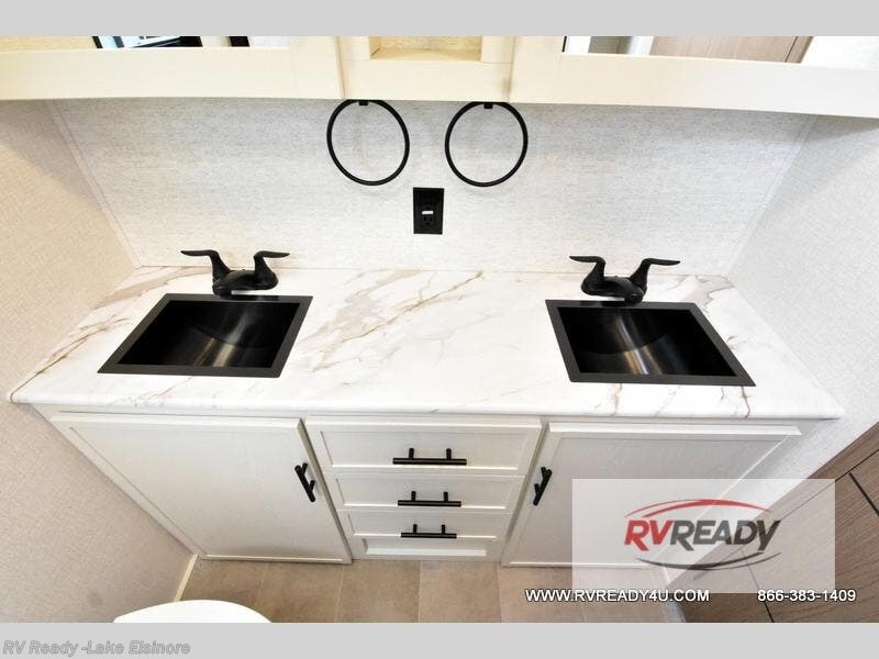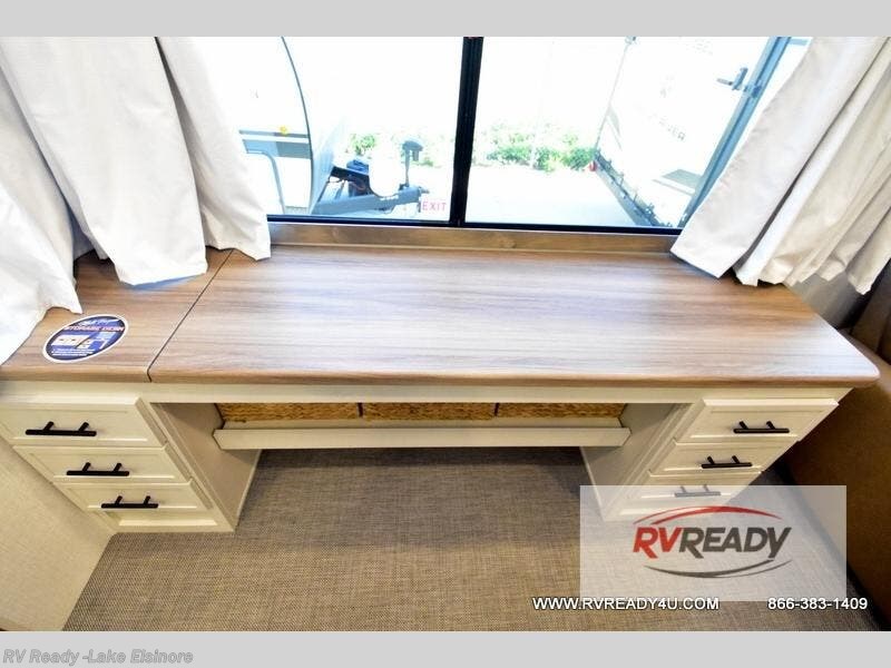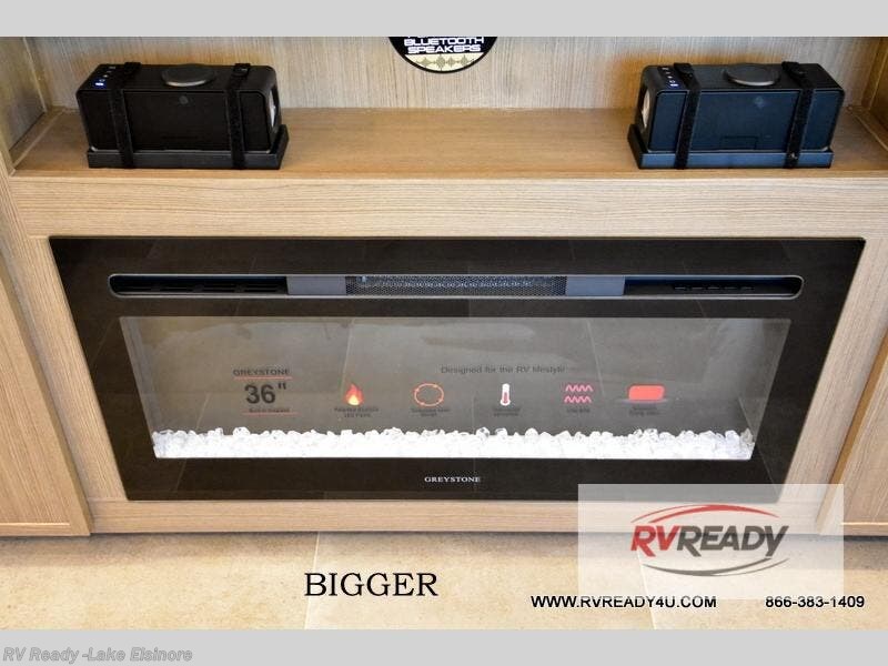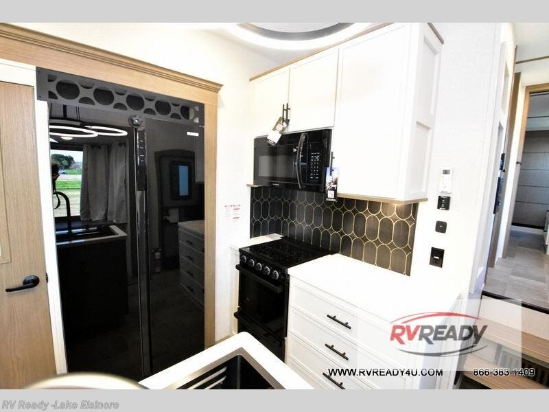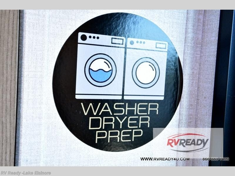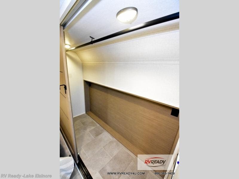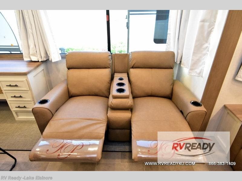 Step inside this luxurious fifth wheel that can sleep the whole gang each night! The rear tri-fold hide-a-bed sofa and theater seating provide a relaxing evening by the entertainment center with a TV. Next to the entertainment center is a hidden door with cabinets and 16 cu. ft. 12V refrigerator, and a 36" x 74" flip-down bunk with storage. The kitchen has plenty of countertop space to prepare your best home cooked meals and an island with four bar stools to enjoy your meals. You also have a desk with storage to get some work done if needed. As you walk up the floating steps, you will notice the full bathroom to your left with a walk-in shower with a skylight for added natural lighting and a dual sink vanity for two to get ready at once. The front private bedroom has a king bed with Versa Tilt technology slide, a dresser next to a bench and a front wardrobe that is prepped for a washer and dryer!