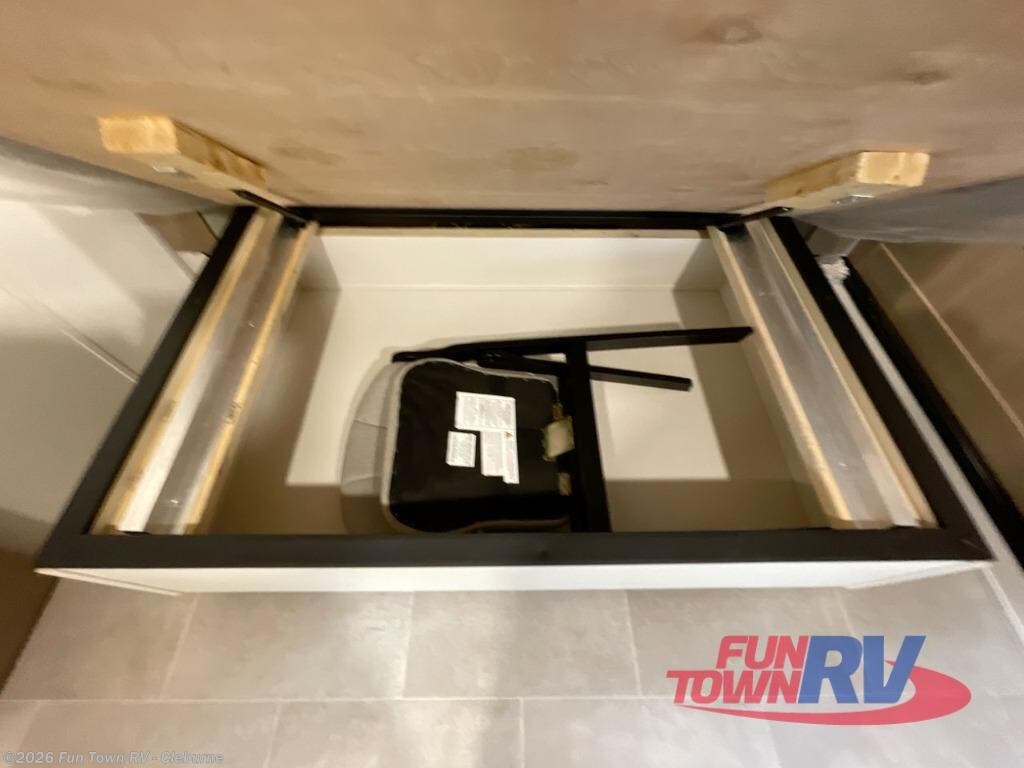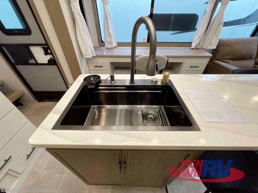 Step inside this luxurious fifth wheel that can sleep five each night! The rear tri-fold hide-a-bed sofa and theater seating provide a relaxing evening by the entertainment center with a 55" TV. Next to the entertainment center is a hidden door with cabinets and 16 cu. ft. 12V refrigerator, and a 36" x 74" flip-down bunk with storage. The kitchen has plenty of countertop space to prepare your best home cooked meals and an island with four bar stools to enjoy your meals. You also have a desk with storage to get some work done if needed. As you walk up the floating steps, you will notice the full bathroom to your left with a walk-in shower with a skylight for added natural lighting and a dual sink vanity for two to get ready at once. The front private bedroom has a king bed with Versa Tilt technology slide, a dresser next to a bench and a front wardrobe that is prepped for a washer and dryer!