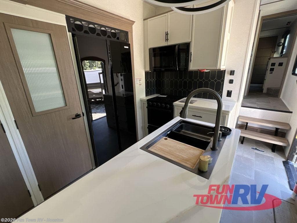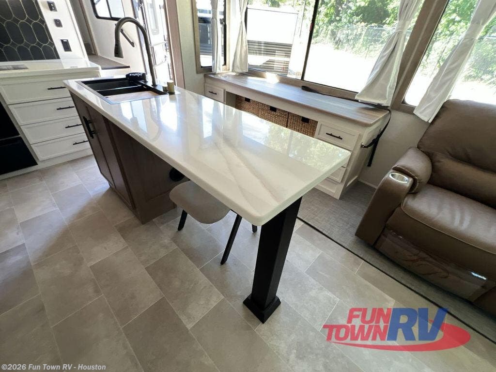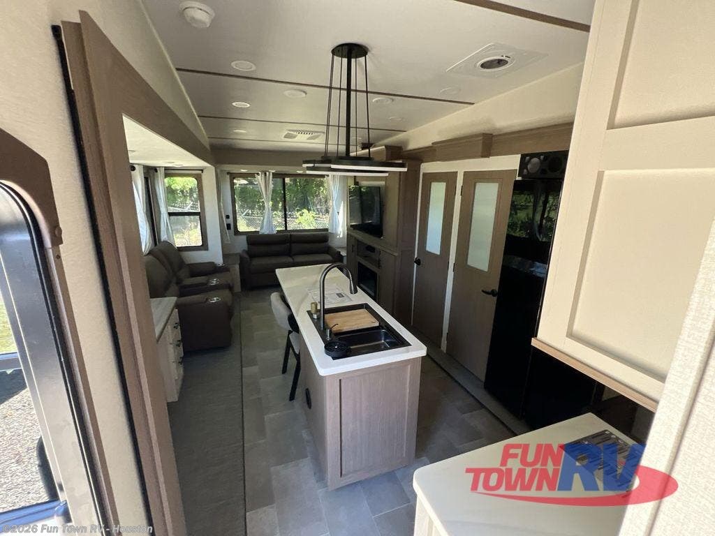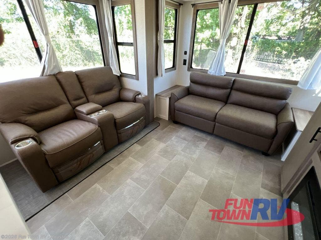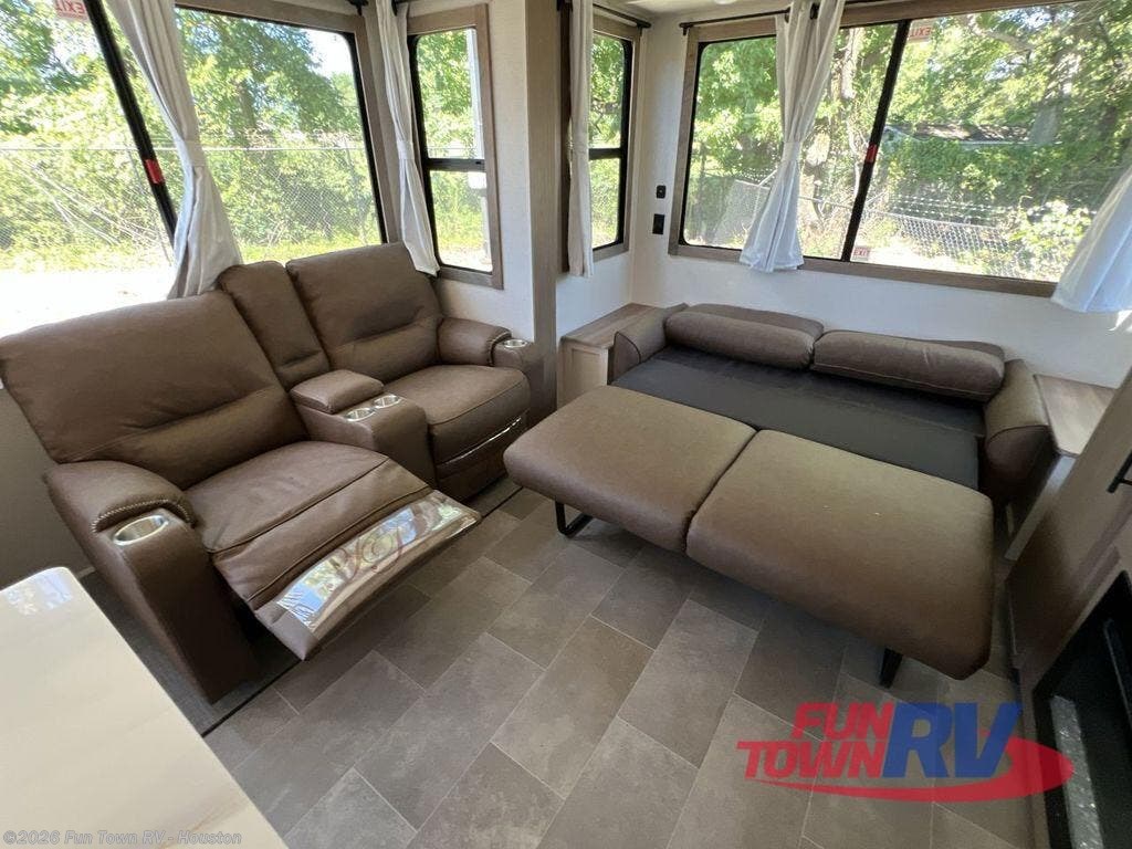 Step inside this luxurious fifth wheel that can sleep five each night! The rear tri-fold hide-a-bed sofa and theater seating provide a relaxing evening by the entertainment center with a 55" TV. Next to the entertainment center is a hidden door with cabinets and 16 cu. ft. 12V refrigerator, and a 36" x 74" flip-down bunk with storage. The kitchen has plenty of countertop space to prepare your best home cooked meals and an island with four bar stools to enjoy your meals. You also have a desk with storage to get some work done if needed. As you walk up the floating steps, you will notice the full bathroom to your left with a walk-in shower with a skylight for added natural lighting and a dual sink vanity for two to get ready at once. The front private bedroom has a king bed with Versa Tilt technology slide, a dresser next to a bench and a front wardrobe that is prepped for a washer and dryer!