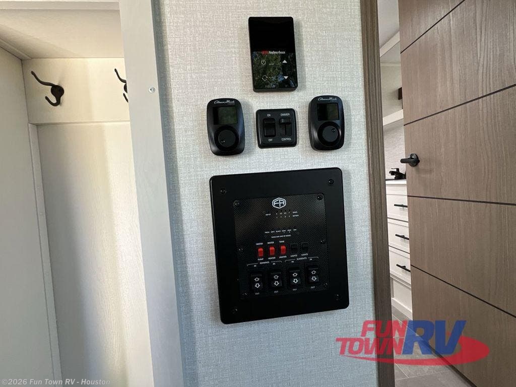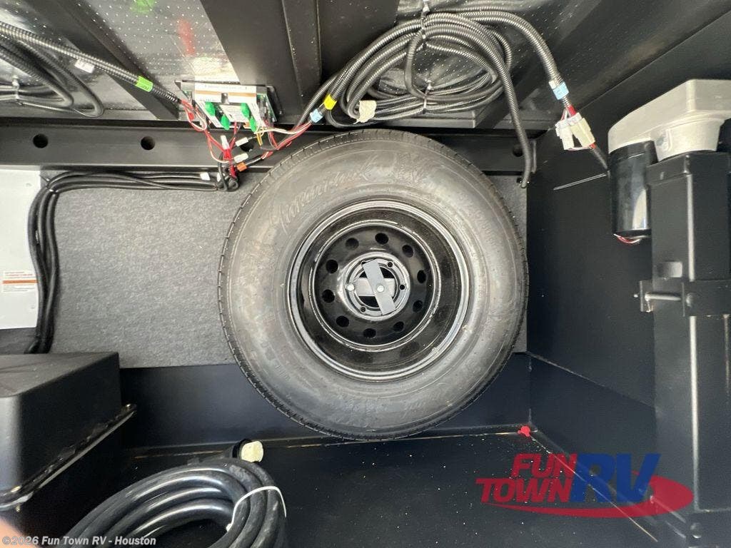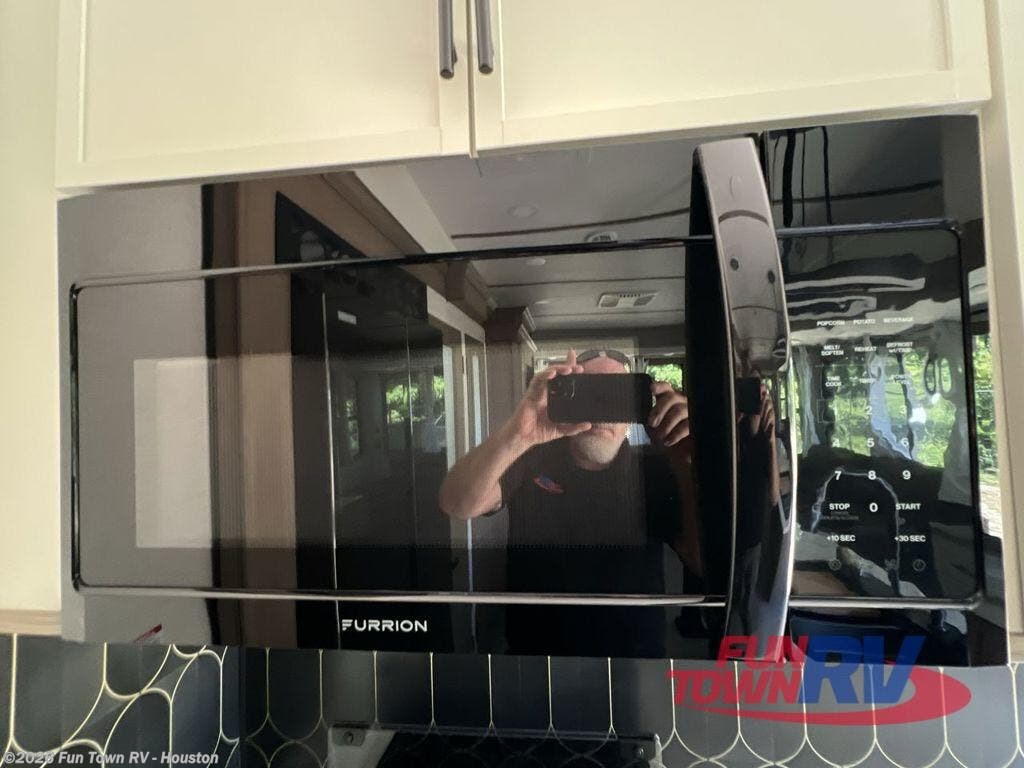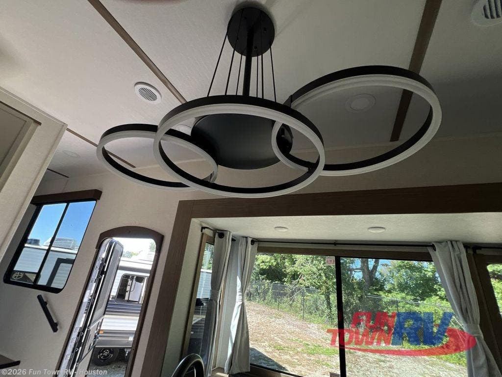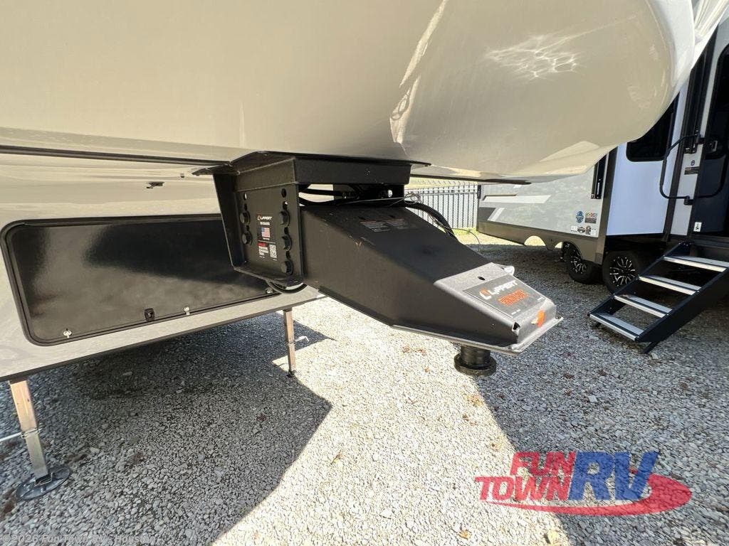 Step inside this luxurious fifth wheel that can sleep five each night! The rear tri-fold hide-a-bed sofa and theater seating provide a relaxing evening by the entertainment center with a 55" TV. Next to the entertainment center is a hidden door with cabinets and 16 cu. ft. 12V refrigerator, and a 36" x 74" flip-down bunk with storage. The kitchen has plenty of countertop space to prepare your best home cooked meals and an island with four bar stools to enjoy your meals. You also have a desk with storage to get some work done if needed. As you walk up the floating steps, you will notice the full bathroom to your left with a walk-in shower with a skylight for added natural lighting and a dual sink vanity for two to get ready at once. The front private bedroom has a king bed with Versa Tilt technology slide, a dresser next to a bench and a front wardrobe that is prepped for a washer and dryer!