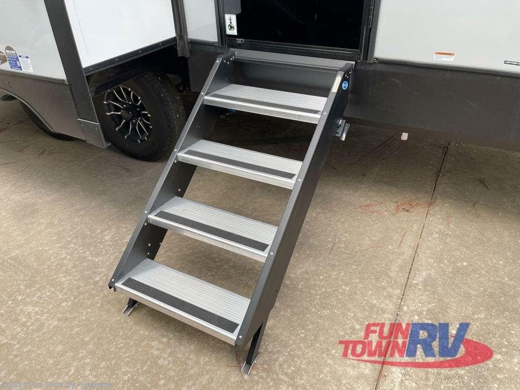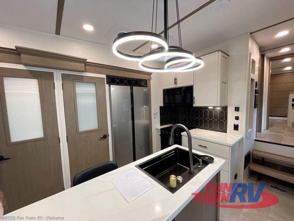 Step inside this luxurious fifth wheel that can sleep five each night! The rear tri-fold hide-a-bed sofa and theater seating provide a relaxing evening by the entertainment center with a 55" TV. Next to the entertainment center is a hidden door with cabinets and 16 cu. ft. 12V refrigerator, and a 36" x 74" flip-down bunk with storage. The kitchen has plenty of countertop space to prepare your best home cooked meals and an island with four bar stools to enjoy your meals. You also have a desk with storage to get some work done if needed. As you walk up the floating steps, you will notice the full bathroom to your left with a walk-in shower with a skylight for added natural lighting and a dual sink vanity for two to get ready at once. The front private bedroom has a king bed with Versa Tilt technology slide, a dresser next to a bench and a front wardrobe that is prepped for a washer and dryer!