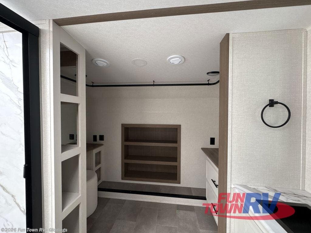 It's easy to see why this fifth wheel was voted Best New Model for 2025 by RV Pro! There are many residential features, such as a middle table with four seats, dual recliners, a desk to get some work done, and a master bedroom you are sure to love. You'll find a king bed with Versa Tilt technology, a dresser, and TV prep. A front master bath includes a walk-in shower with a skylight, dual bath sinks with a back-lit mirror, and a closet with shelves. The middle mud room includes washer/dryer prep, counter space and a pull-out drying rack to hang up swim clothes, towels, and more. Everyone will enjoy spending time in the main living room that includes dual opposing slides, a tri-fold sofa, and an entertainment center with hidden storage behind. And the chef of your group will love the rear kitchen with its 16 cu. ft. 12V refrigerator and pantry, an oven, and plenty of counter space. Head outdoors to enjoy the two power awnings in the evening!