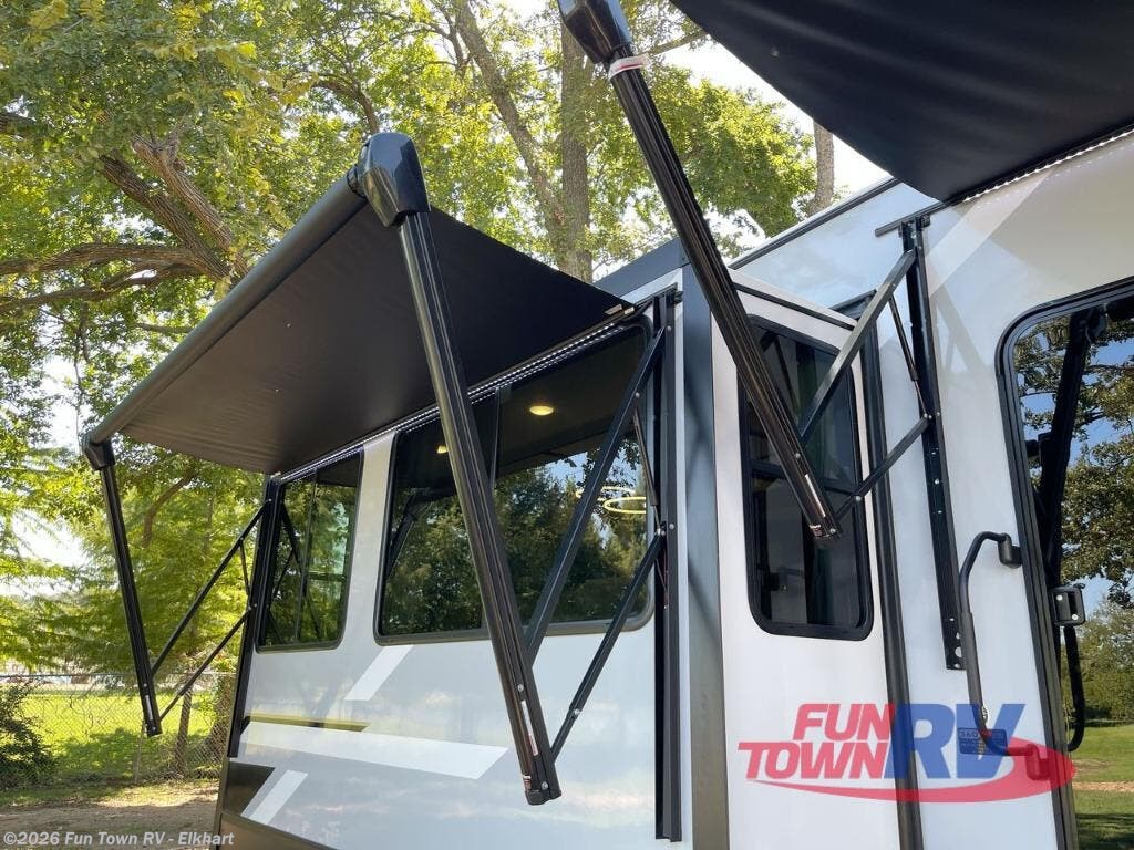 It's easy to see why this fifth wheel was voted Best New Model for 2025 by RV Pro! There are many residential features, such as a middle table with four seats, dual recliners, a desk to get some work done, and a master bedroom you are sure to love. You'll find a king bed with Versa Tilt technology, a dresser, and TV prep. A front master bath includes a walk-in shower with a skylight, dual bath sinks with a back-lit mirror, and a closet with shelves. The middle mud room includes washer/dryer prep, counter space and a pull-out drying rack to hang up swim clothes, towels, and more. Everyone will enjoy spending time in the main living room that includes dual opposing slides, a tri-fold sofa, and an entertainment center with hidden storage behind. And the chef of your group will love the rear kitchen with its 16 cu. ft. 12V refrigerator and pantry, an oven, and plenty of counter space. Head outdoors to enjoy the two power awnings in the evening!