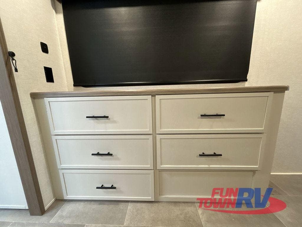 There are many residential features in this 360MYR model, such as a middle table with four seats, dual recliners, a desk to get some work done, and a master bedroom you are sure to love. You'll find a king bed with Versa Tilt technology, a dresser, and TV prep. A front master bath includes a walk-in shower with a skylight, dual bath sinks with a back-lit mirror, and a closet with shelves. The middle half bath includes washer/dryer prep, counter space and a shelf for all your essentials, clothes, and gear. Everyone will enjoy spending time in the main living room that includes dual opposing slides, a tri-fold sofa, and an entertainment center with hidden storage behind. And the chef of your group will love the rear kitchen with its 16 cu. ft. 12V refrigerator and pantry, an oven, and plenty of counter space. Head outdoors to enjoy the two power awnings in the evening!