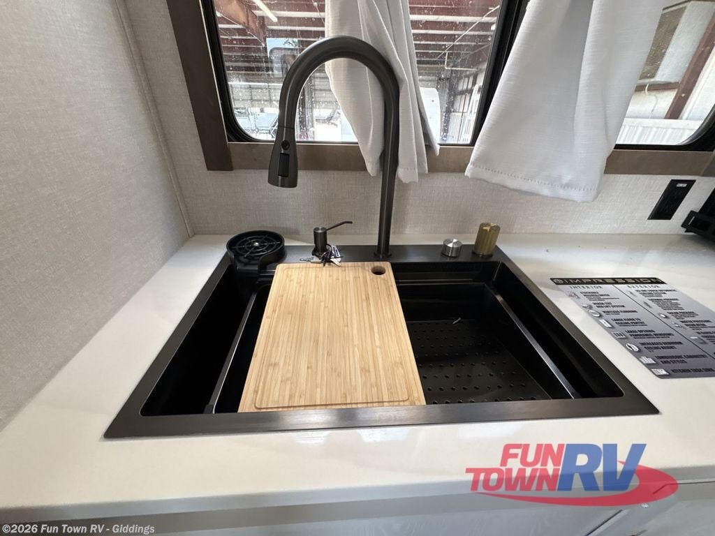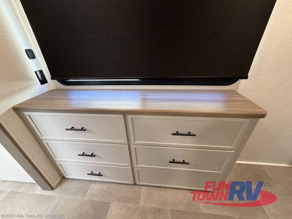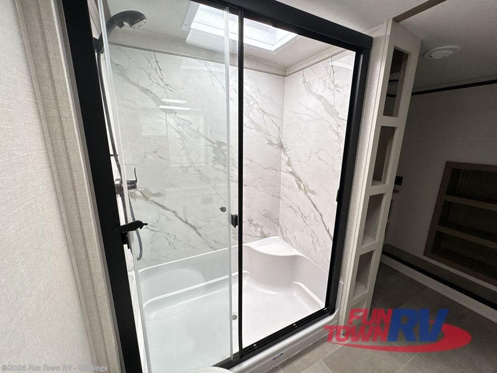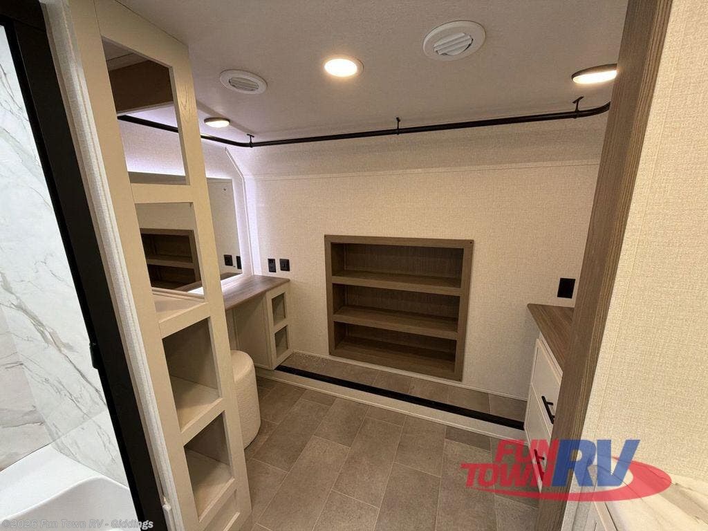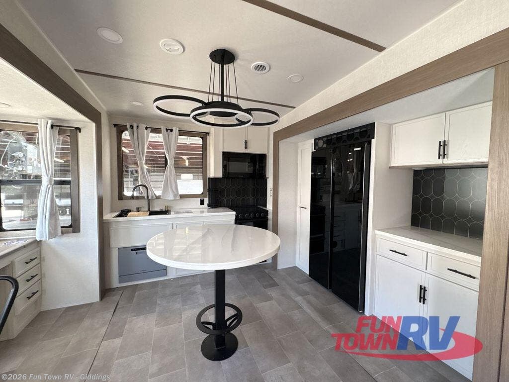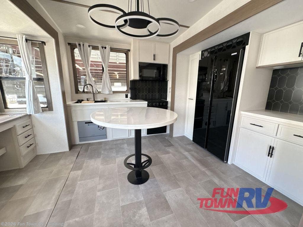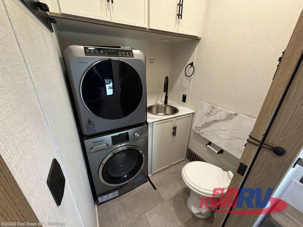 It's easy to see why this fifth wheel was voted Best New Model for 2025 by RV Pro! There are many residential features, such as a middle table with four seats, dual recliners, a desk to get some work done, and a master bedroom you are sure to love. You'll find a king bed with Versa Tilt technology, a dresser, and TV prep. A front master bath includes a walk-in shower with a skylight, dual bath sinks with a back-lit mirror, and a closet with shelves. The middle mud room includes washer/dryer prep, counter space and a pull-out drying rack to hang up swim clothes, towels, and more. Everyone will enjoy spending time in the main living room that includes dual opposing slides, a tri-fold sofa, and an entertainment center with hidden storage behind. And the chef of your group will love the rear kitchen with its 16 cu. ft. 12V refrigerator and pantry, an oven, and plenty of counter space. Head outdoors to enjoy the two power awnings in the evening!