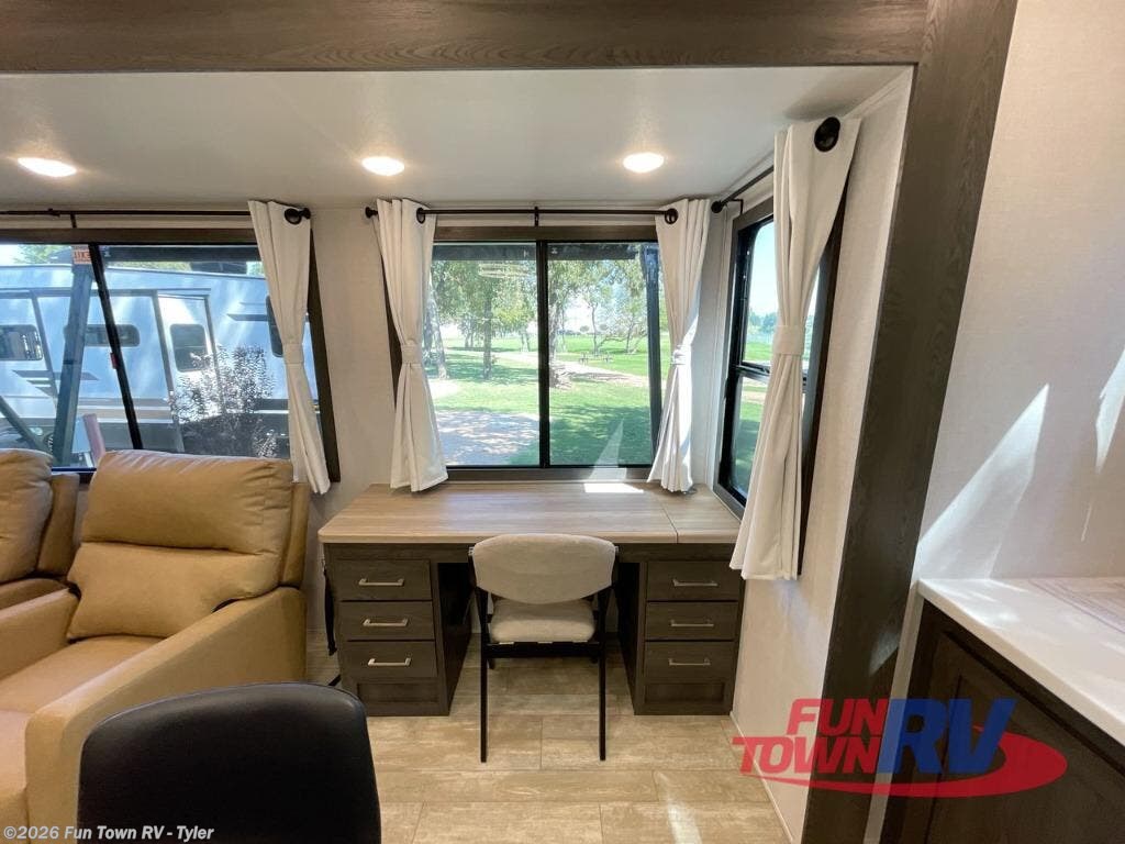 It's easy to see why this fifth wheel was voted Best New Model for 2025 by RV Pro! There are many residential features, such as a middle table with four seats, dual recliners, a desk to get some work done, and a master bedroom you are sure to love. You'll find a king bed with Versa Tilt technology, a dresser, and TV prep. A front master bath includes a walk-in shower with a skylight, dual bath sinks with a back-lit mirror, and a closet with shelves. The middle mud room includes washer/dryer prep, counter space and a pull-out drying rack to hang up swim clothes, towels, and more. Everyone will enjoy spending time in the main living room that includes dual opposing slides, a tri-fold sofa, and an entertainment center with hidden storage behind. And the chef of your group will love the rear kitchen with its 16 cu. ft. 12V refrigerator and pantry, an oven, and plenty of counter space. Head outdoors to enjoy the two power awnings in the evening!