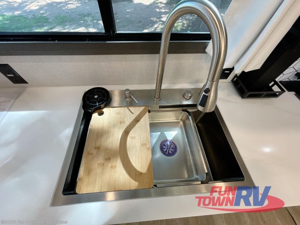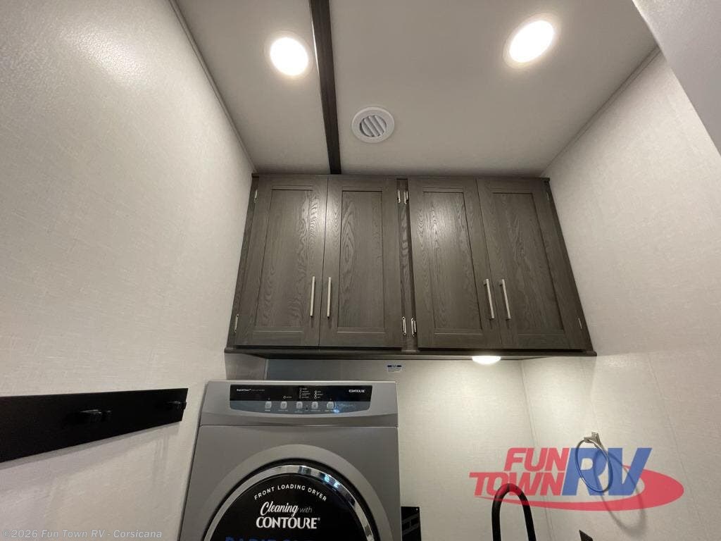 It's easy to see why this fifth wheel was voted Best New Model for 2025 by RV Pro! There are many residential features, such as a middle table with four seats, dual recliners, a desk to get some work done, and a master bedroom you are sure to love. You'll find a king bed with Versa Tilt technology, a dresser, and TV prep. A front master bath includes a walk-in shower with a skylight, dual bath sinks with a back-lit mirror, and a closet with shelves. The middle mud room includes washer/dryer prep, counter space and a pull-out drying rack to hang up swim clothes, towels, and more. Everyone will enjoy spending time in the main living room that includes dual opposing slides, a tri-fold sofa, and an entertainment center with hidden storage behind. And the chef of your group will love the rear kitchen with its 16 cu. ft. 12V refrigerator and pantry, an oven, and plenty of counter space. Head outdoors to enjoy the two power awnings in the evening!