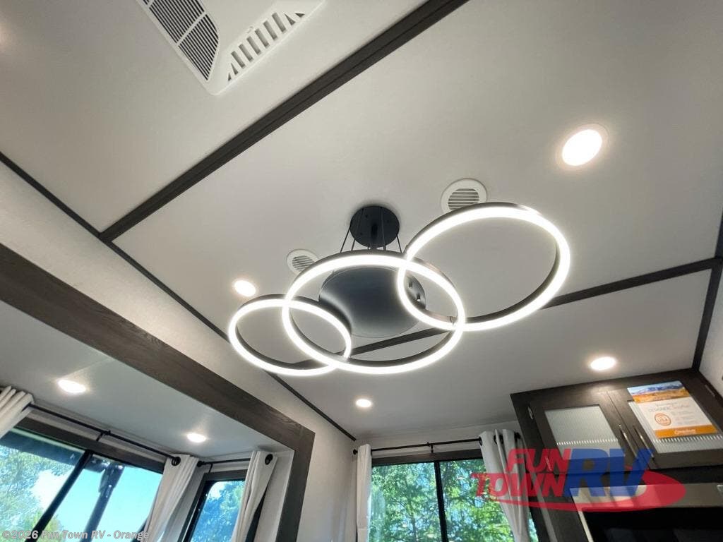 It's easy to see why this fifth wheel was voted Best New Model for 2025 by RV Pro! There are many residential features, such as a middle table with four seats, dual recliners, a desk to get some work done, and a master bedroom you are sure to love. You'll find a king bed with Versa Tilt technology, a dresser, and TV prep. A front master bath includes a walk-in shower with a skylight, dual bath sinks with a back-lit mirror, and a closet with shelves. The middle mud room includes washer/dryer prep, counter space and a pull-out drying rack to hang up swim clothes, towels, and more. Everyone will enjoy spending time in the main living room that includes dual opposing slides, a tri-fold sofa, and an entertainment center with hidden storage behind. And the chef of your group will love the rear kitchen with its 16 cu. ft. 12V refrigerator and pantry, an oven, and plenty of counter space. Head outdoors to enjoy the two power awnings in the evening!