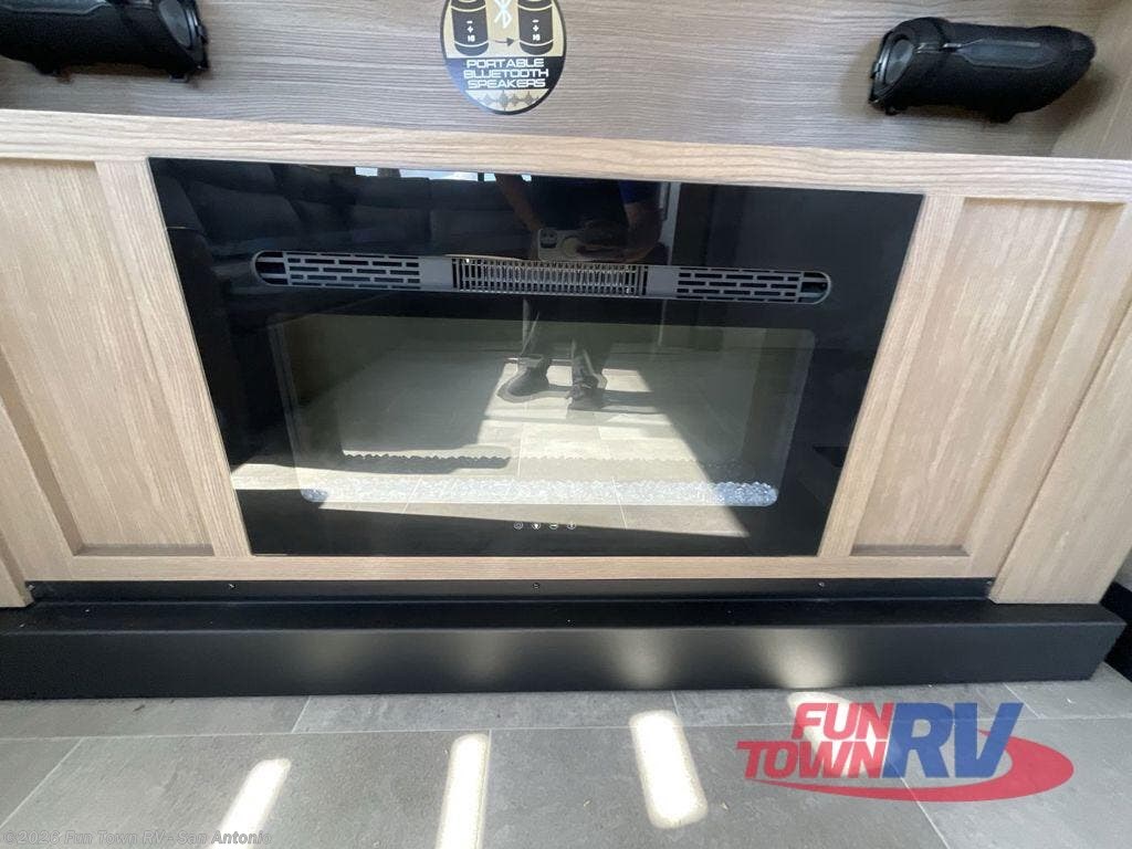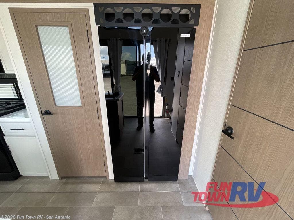 Plan to stay awhile in this four slide out fifth wheel! There is a triple-slide patio door that opens into the kitchen, complete with a kitchen island, walk-in pantry and 16 cu. ft. 12V refrigerator, and a convenient half bath with storage. There are reclining theater seats with a chaise lounge across from an entertainment center and fireplace with hidden storage behind. The fold-up steps lead up to the loft that includes two bunk mats, a wardrobe, cubby storage, plus two windows, which will make this space bright and open. The full bath towards the front includes washer/dryer prep, a walk-in shower with a skylight, and a linen closet to keep towels close by. And you'll love having your own bedroom up front with a king bed with Versa Tilt, a dresser with a bench, and a front wardrobe to keep your clothes wrinkle-free!