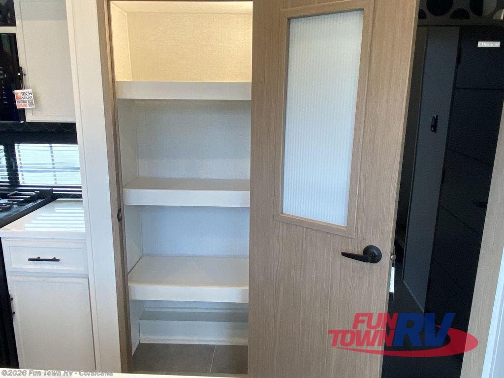 Plan to stay awhile in this four slide out fifth wheel! There is a triple-slide patio door that opens into the kitchen, complete with a kitchen island, walk-in pantry and 16 cu. ft. 12V refrigerator, and a convenient half bath with storage. There are reclining theater seats with a chaise lounge across from an entertainment center and fireplace with hidden storage behind. The fold-up steps lead up to the loft that includes two bunk mats, a wardrobe, cubby storage, plus two windows, which will make this space bright and open. The full bath towards the front includes washer/dryer prep, a walk-in shower with a skylight, and a linen closet to keep towels close by. And you'll love having your own bedroom up front with a king bed with Versa Tilt, a dresser with a bench, and a front wardrobe to keep your clothes wrinkle-free!