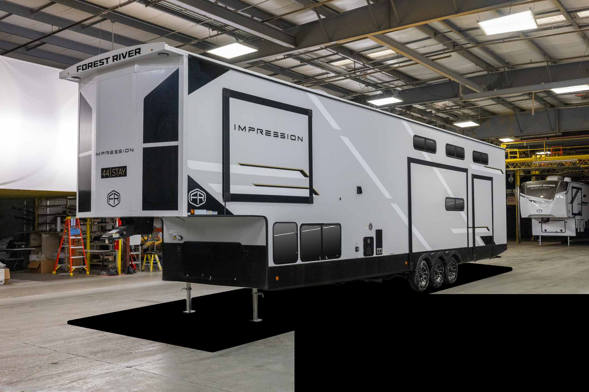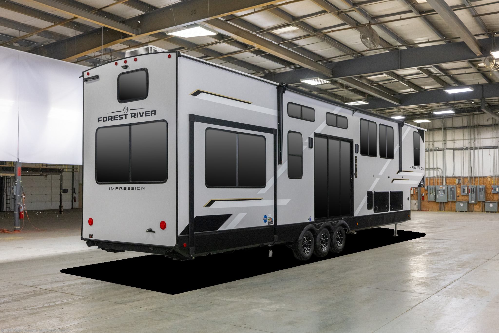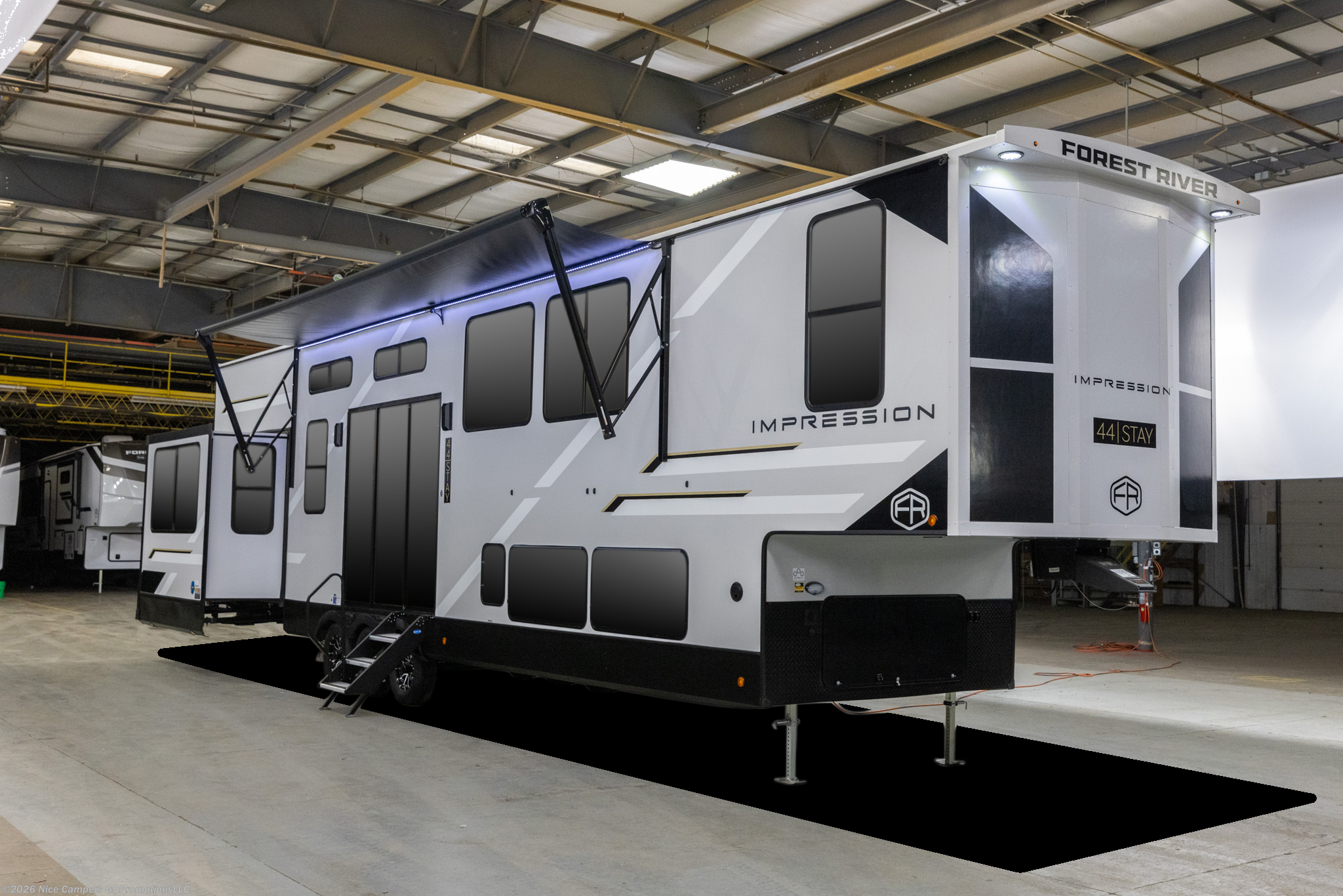 This 2026 Forest River Impression 44STAY is an RV the whole family will love. This 2026 Forest River Impression 44STAY welcomes you into the Forest River family! If you’re looking for a family RV, you’ve found it: this rig sleeps 8. This rig cuts no corners on space, expanding into a massive living area with 4 slides. Cook up the best camping meals with appliances like the fridge, oven. The theater seating and , or TV make it easy to spend time together as a family. You’ll never get too hot or too cold inside your rig thanks to the heating option. Go longer without filling up thanks to the 57 gallon fresh water tanks. Outside, you’ll find awning, black tank flush, detachable, detachable power cord, hitch, power awning, pvc roof, skylight and stabilizer jacks.
