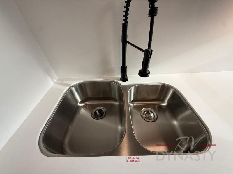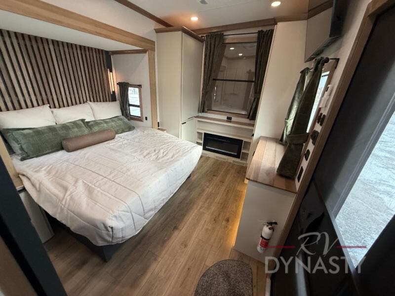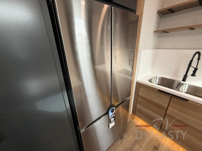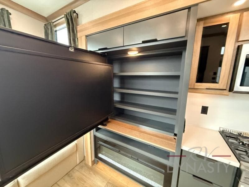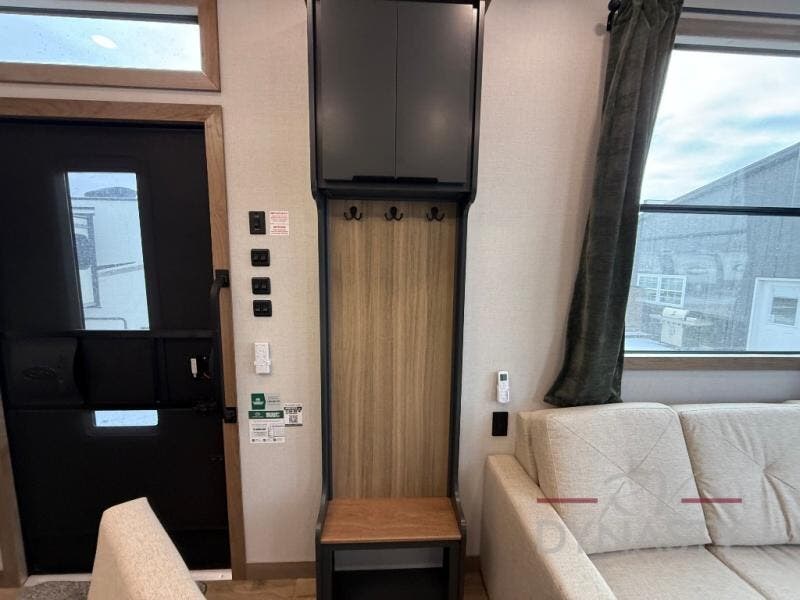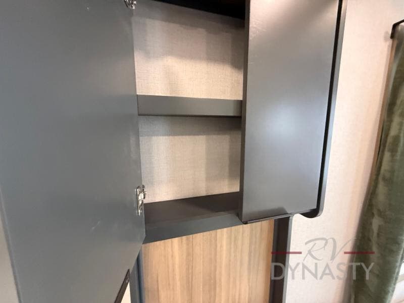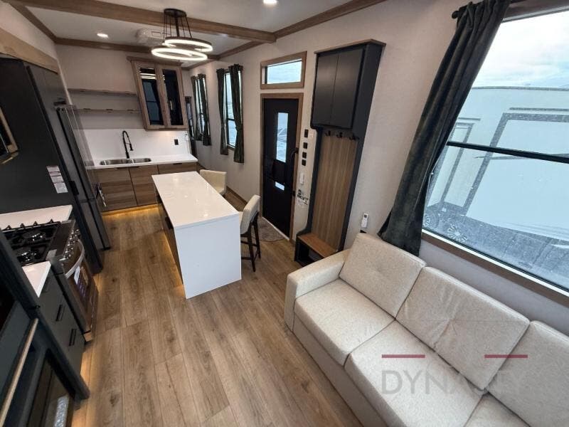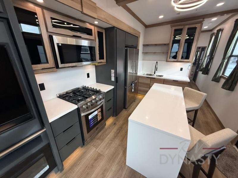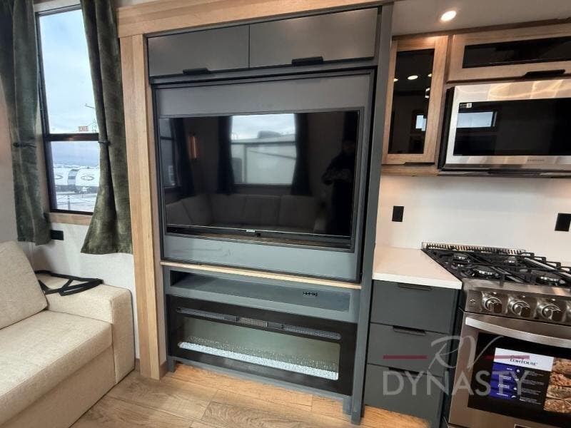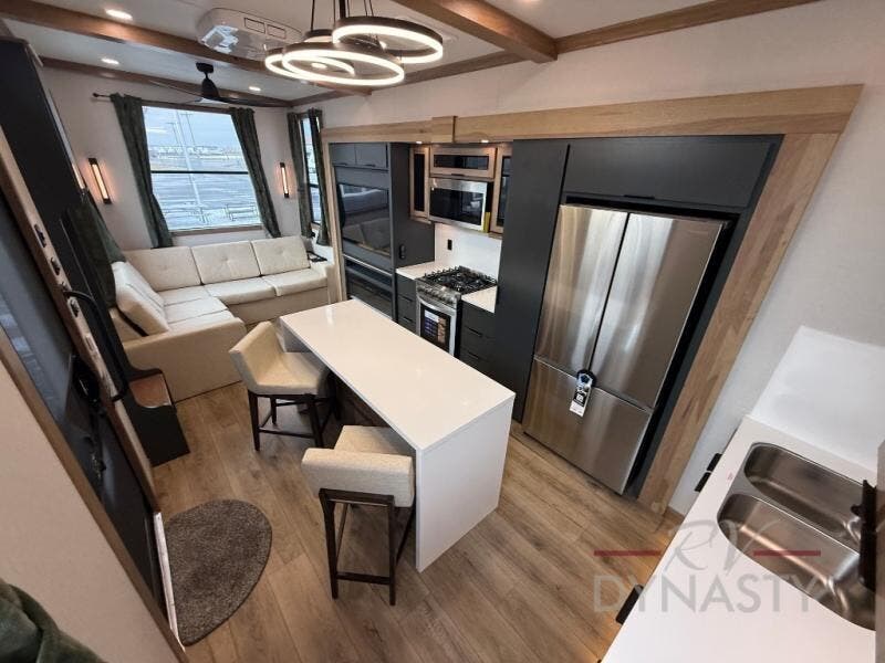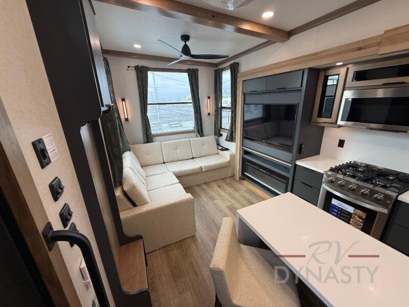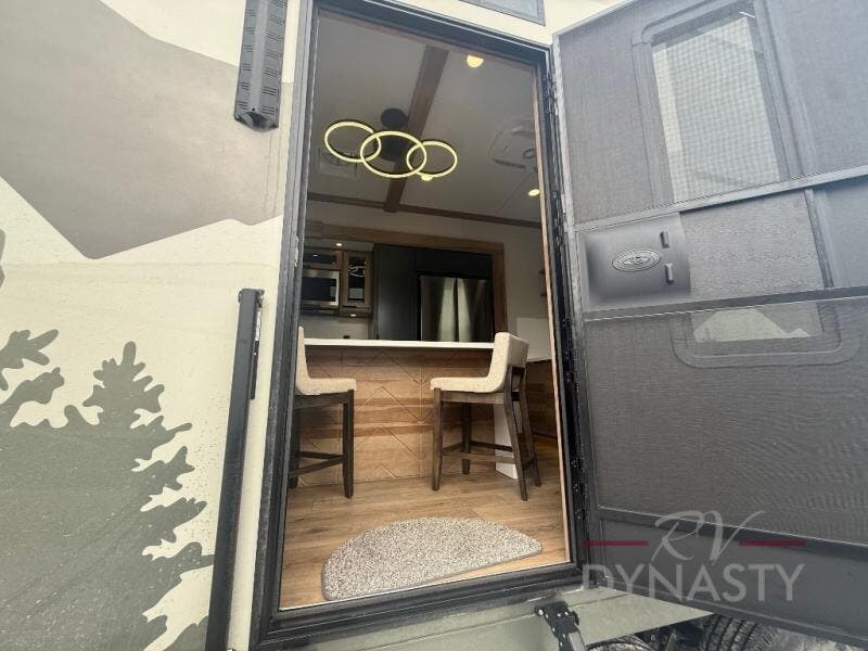 It won't be hard to find comfort in this dual slide, dual entry destination trailer! One of the entry doors conveniently opens to the front private bedroom where you'll find a queen bed slide out with a king bed option, dual closets with shelves in between, plus a dresser to keep everything tidy. If you have guests staying over, they can sleep on the L-shaped sleeper sofa in the rear living area, which is also directly across from the entertainment center for easy viewing. The chef of your group will love the spacious kitchen, complete with all the kitchen appliances to create their best meals and a large kitchen island with four chairs.