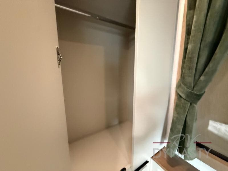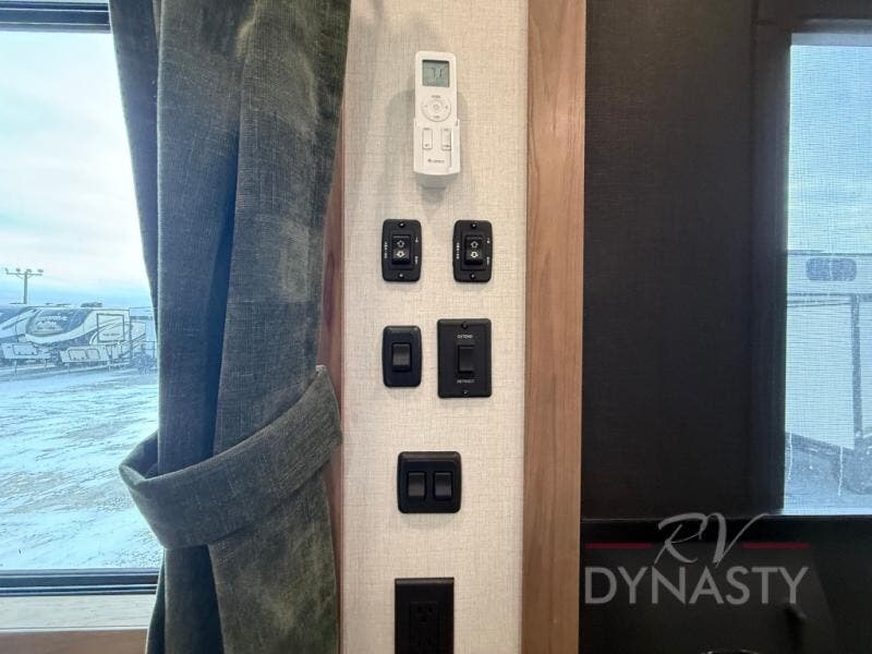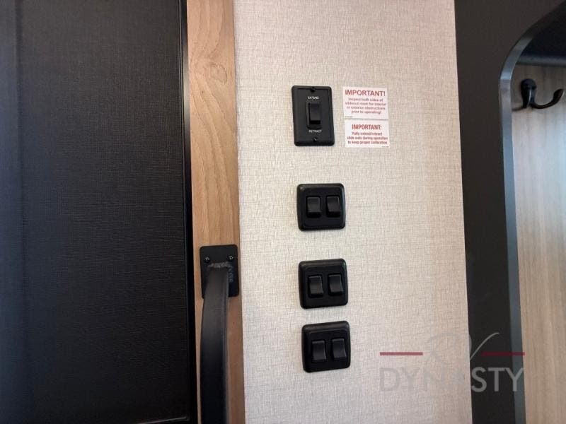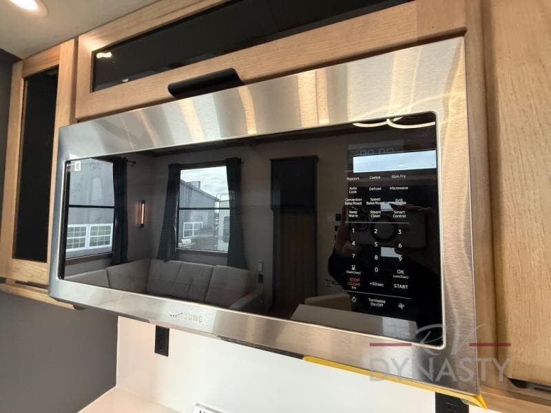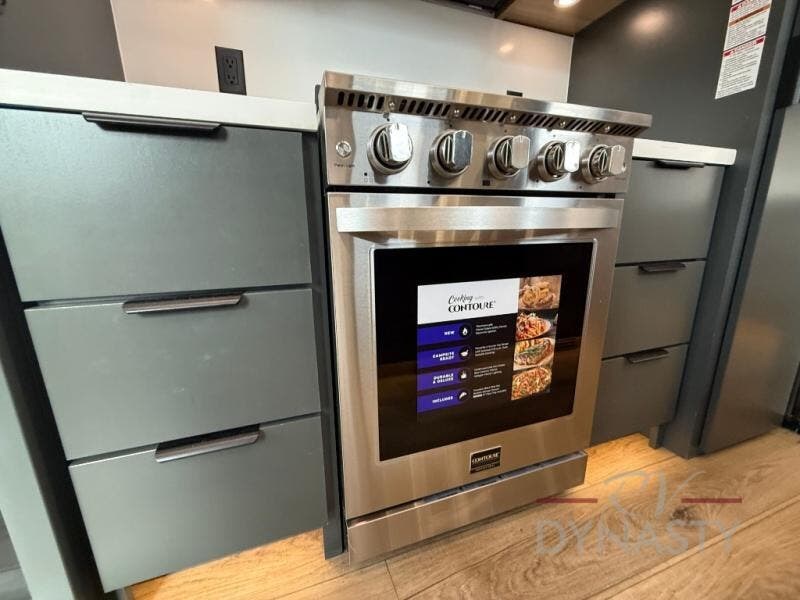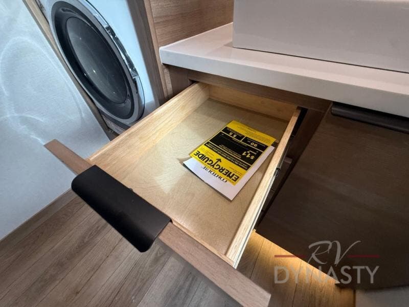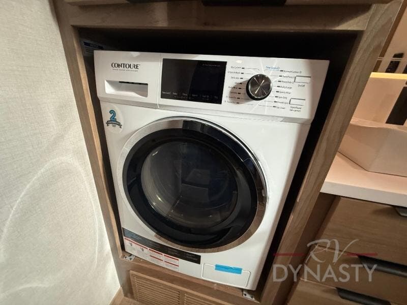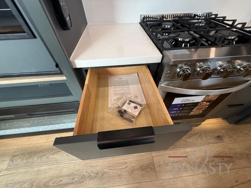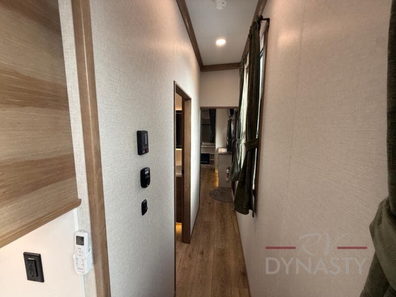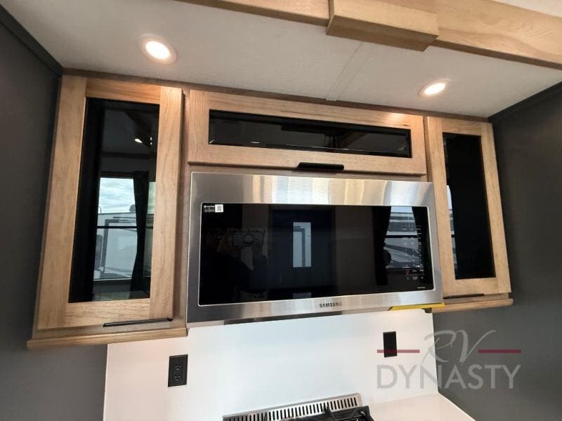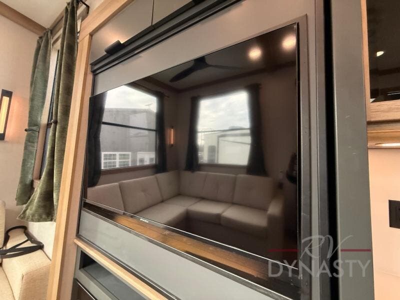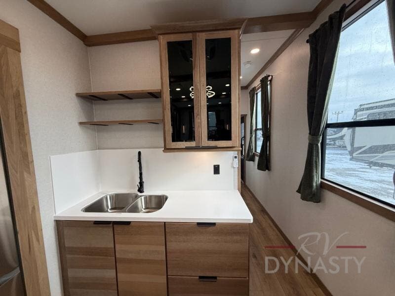 It won't be hard to find comfort in this dual slide, dual entry destination trailer! One of the entry doors conveniently opens to the front private bedroom where you'll find a queen bed slide out with a king bed option, dual closets with shelves in between, plus a dresser to keep everything tidy. If you have guests staying over, they can sleep on the L-shaped sleeper sofa in the rear living area, which is also directly across from the entertainment center for easy viewing. The chef of your group will love the spacious kitchen, complete with all the kitchen appliances to create their best meals and a large kitchen island with four chairs.