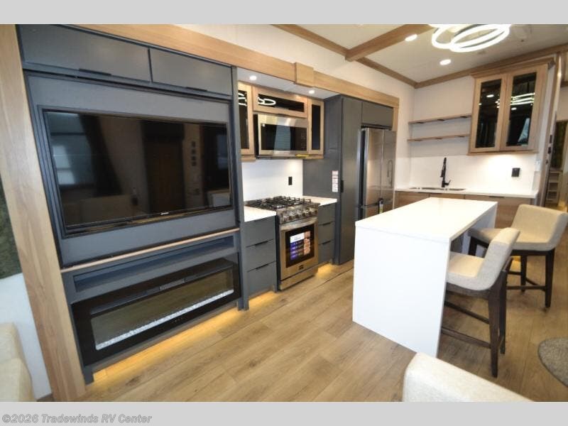 It won't be hard to find comfort in this dual slide, dual entry destination trailer! One of the entry doors conveniently opens to the front private bedroom where you'll find a queen bed slide out with a king bed option, dual closets with shelves in between, plus a dresser to keep everything tidy. If you have guests staying over, they can sleep on the L-shaped sleeper sofa in the rear living area, which is also directly across from the entertainment center for easy viewing. The chef of your group will love the spacious kitchen, complete with all the kitchen appliances to create their best meals and a large kitchen island with four chairs.