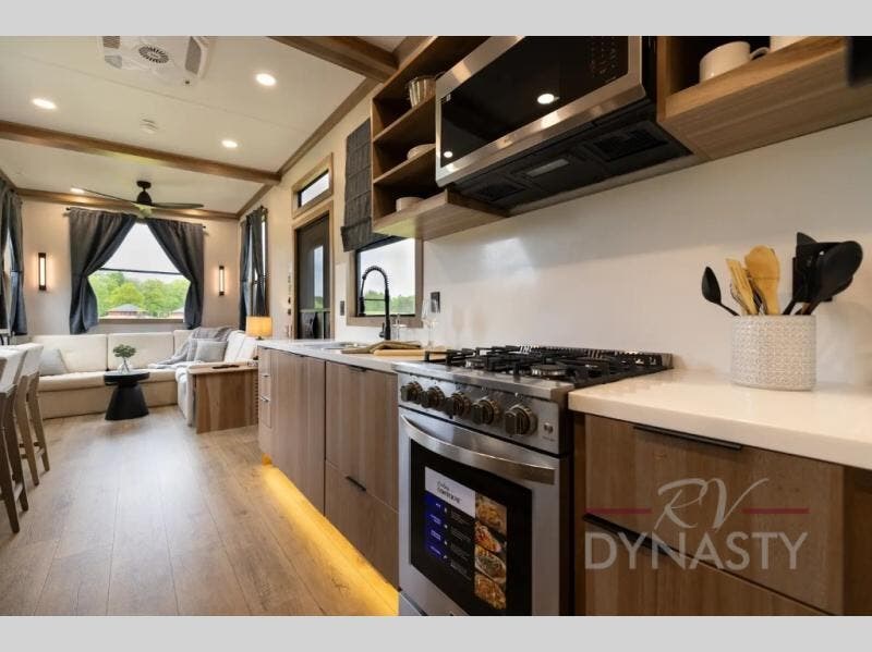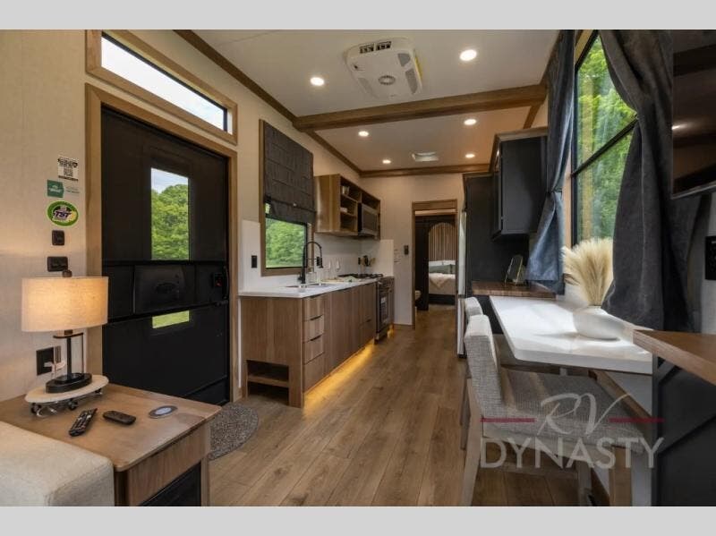 Luxury abounds in the Lost Pines destination trailer by Forest River. Each model features 3" hung wall construction, a rolled fiberglass roof, a thermofoil lined underbelly, and an Azdel gel coat fiberglass exterior wall for added durability. The full-body paint with 4x Clear Coat is sure to turn heads as you travel to your destination, and the LCI Road Armor suspension system will provide a smooth tow. You'll also find dual 40 lb. LP tanks outside, along with a heated full docking station, and MORryde entry steps and Safe-T-Rail. The interior of the Lost Pines is outfitted with luxury vinyl flooring, residential appliances, LED lighting throughout, plus upgraded solid surface countertops and backsplash!