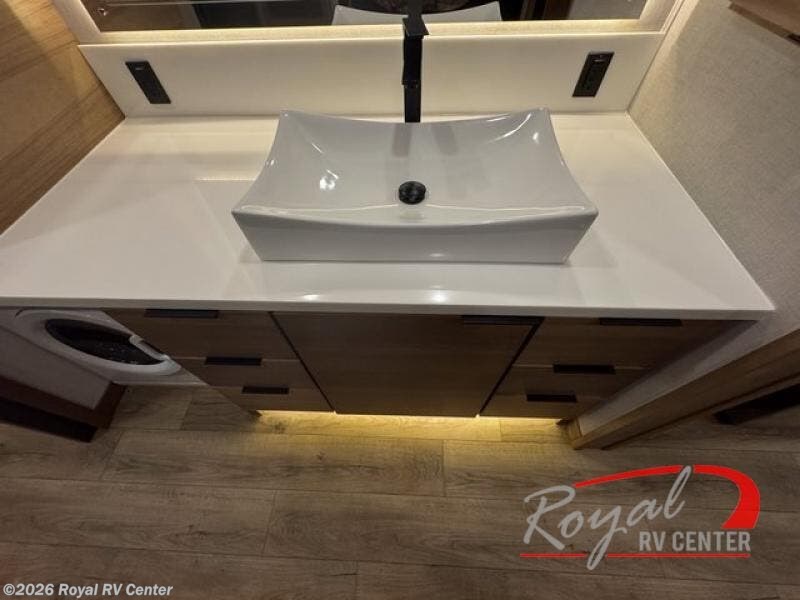 Luxury abounds in the Lost Pines destination trailer by Forest River. Each model features 3" hung wall construction, a rolled fiberglass roof, a thermofoil lined underbelly, and an Azdel gel coat fiberglass exterior wall for added durability. The full-body paint with 4x Clear Coat is sure to turn heads as you travel to your destination, and the LCI Road Armor suspension system will provide a smooth tow. You'll also find dual 40 lb. LP tanks outside, along with a heated full docking station, and MORryde entry steps and Safe-T-Rail. The interior of the Lost Pines is outfitted with luxury vinyl flooring, residential appliances, LED lighting throughout, plus upgraded solid surface countertops and backsplash!