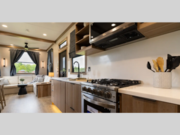 For those who appreciate a destination trailer easier to maintain, this slide-less unit will be perfect for you! Your crew can relax comfortably in the front living area that includes an L-shaped sleeper sofa across from an entertainment center or enjoy the views out the window in front of the countertop with chairs. The full kitchen will allow you to make your best home-cooked meals, and the spacious walk-through bath is easily accessible. You're sure to love the rear bedroom that includes a queen bed with a king bed option, along with dual bedroom closets to keep everything organized!