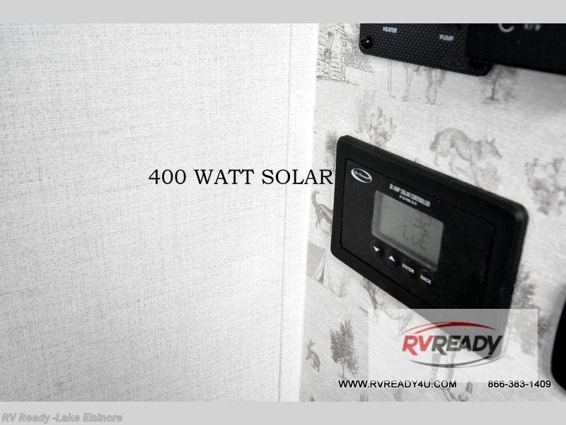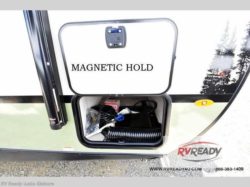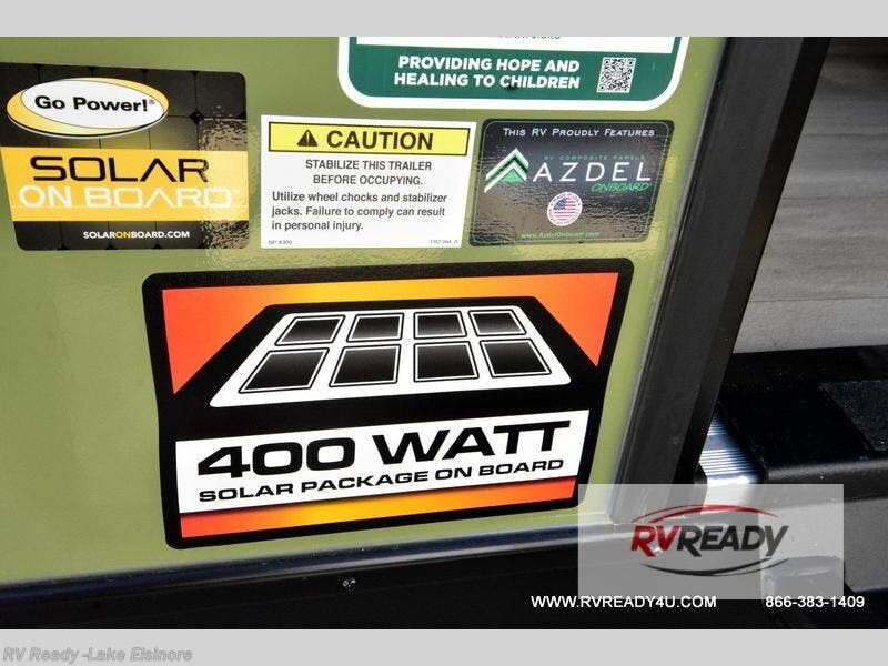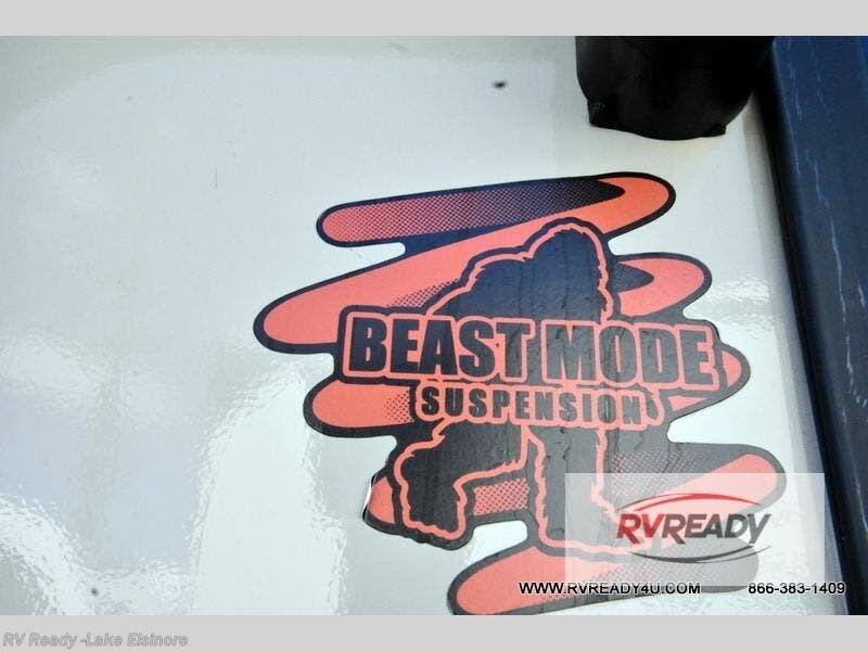 This easy to tow trailer is perfect for weekend trips to the lake! Once you're set up at camp, put out the patio awning, make lunch on the outside kitchen, and grab your camp chairs from the slam latch cargo doors with pass-thru lighting. A jackknife sofa inside will provide a place to relax in the evenings, and a full bath means you won't have to use the camp's facilities. There is also a bar top with two seats and a flip-up window where you can enjoy your morning coffee at! The rear corner kitchen includes microwave and cooktop plus a pantry and refrigerator for food storage. When it's time to call it a night, the front queen bed is sure to bring comfort! When the optional Beast Mode Package on this model is chosen, you'll enjoy a 400-watt solar package, a fresh water filter, a Maxxair roof vent cover, plus a Beast Mode independent suspension for better handling.