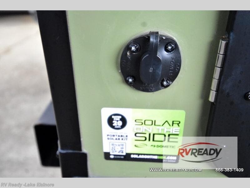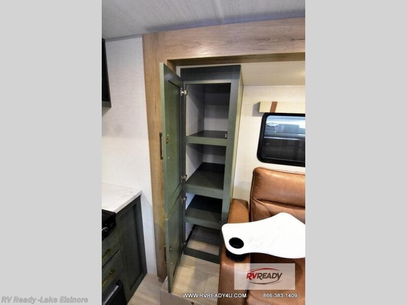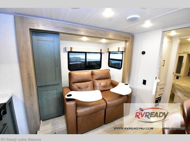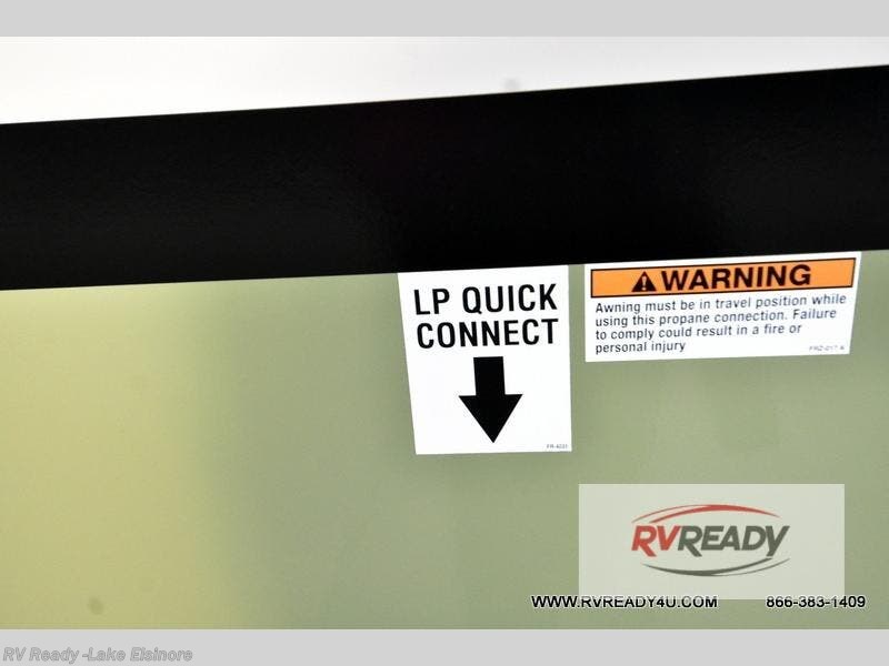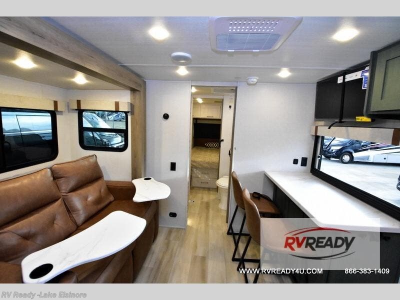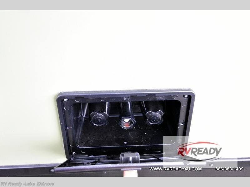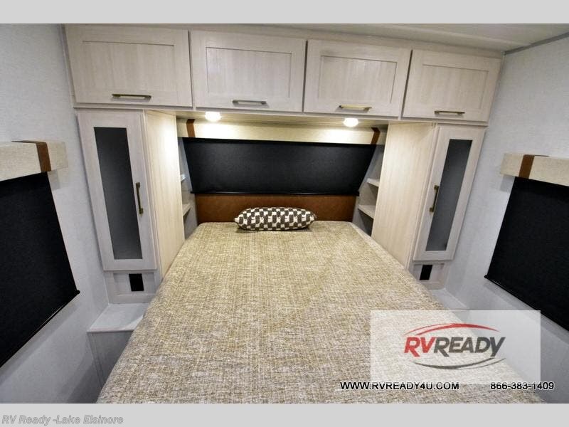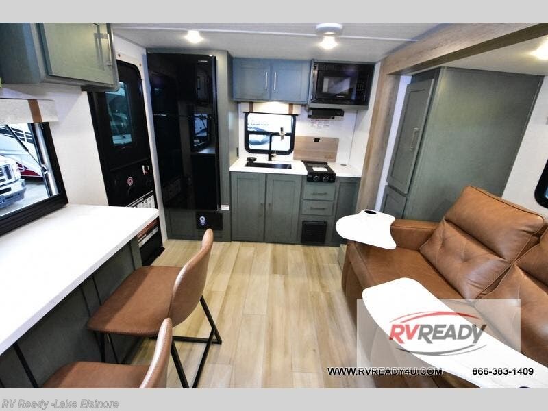 You'll love camping in this couple's trailer! There is a queen bed in the front bedroom, along with dual bedside wardrobes and overhead storage for clothes, books and more. And don't overlook the spacious walk-thru bath! Once you've made breakfast in the rear kitchen or on the outside kitchen, you can dine at the bar top with chairs and a flip-up window. There is also a Trailgate Outdoor Bar if you decide to dine outdoors!