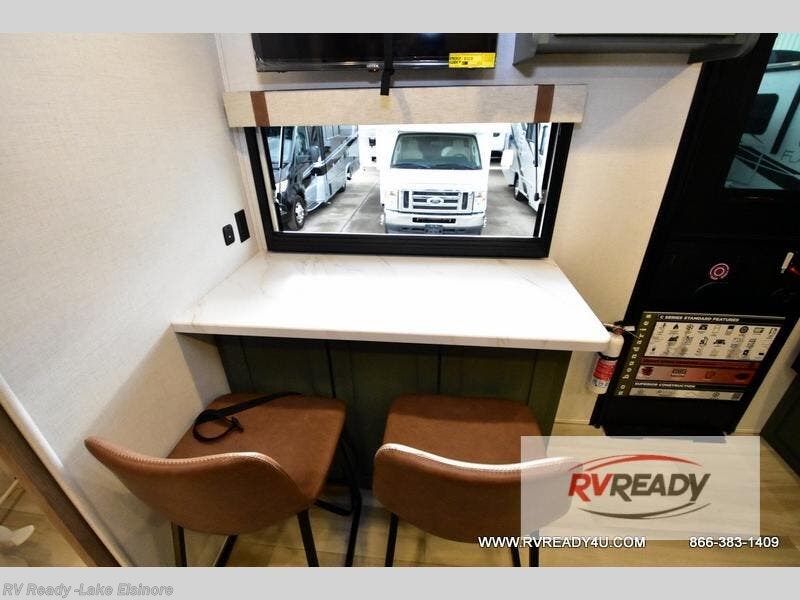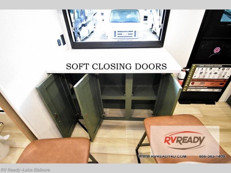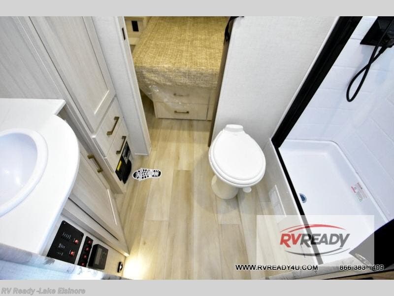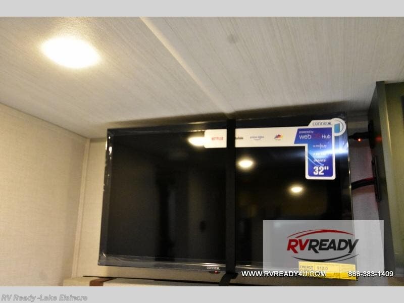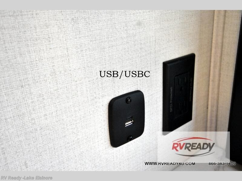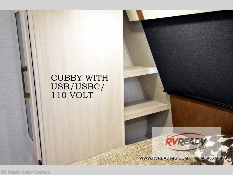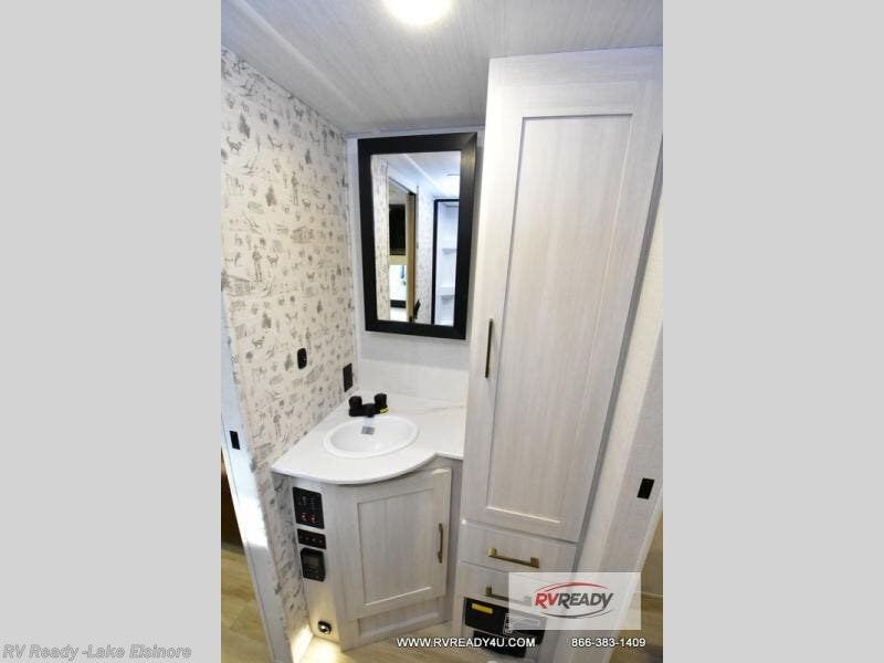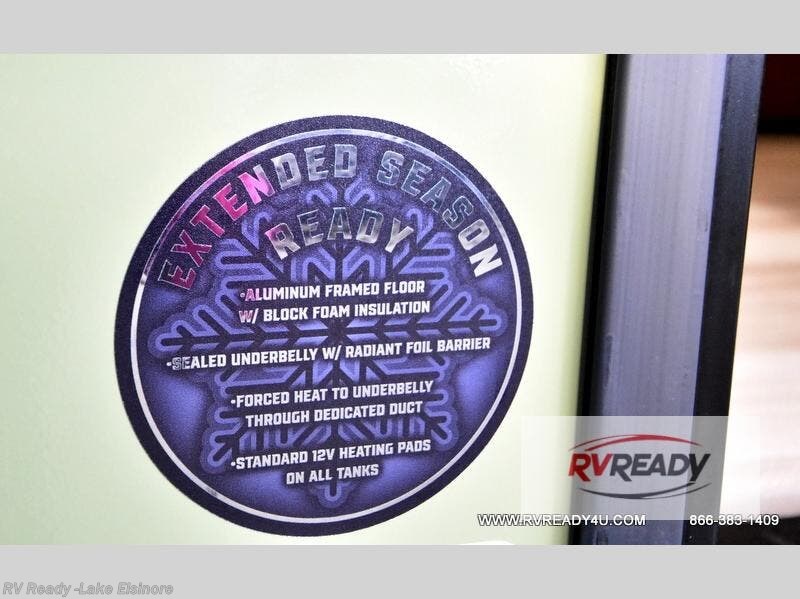 You'll love camping in this couple's trailer! There is a queen bed in the front bedroom, along with dual bedside wardrobes and overhead storage for clothes, books and more. And don't overlook the spacious walk-thru bath! Once you've made breakfast in the rear kitchen or on the outside kitchen, you can dine at the bar top with chairs and a flip-up window. There is also a Trailgate Outdoor Bar if you decide to dine outdoors!