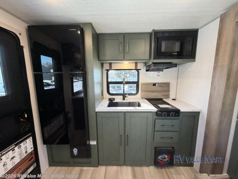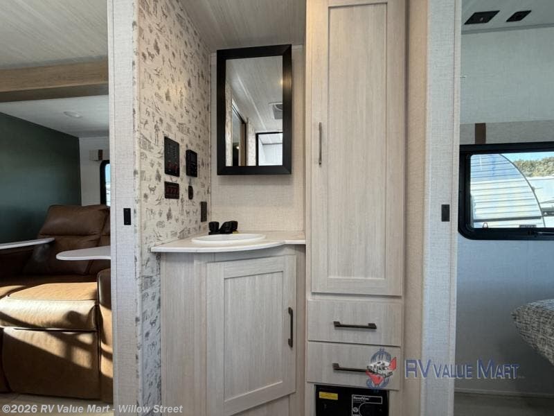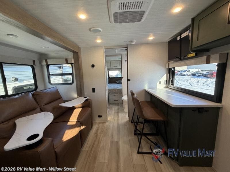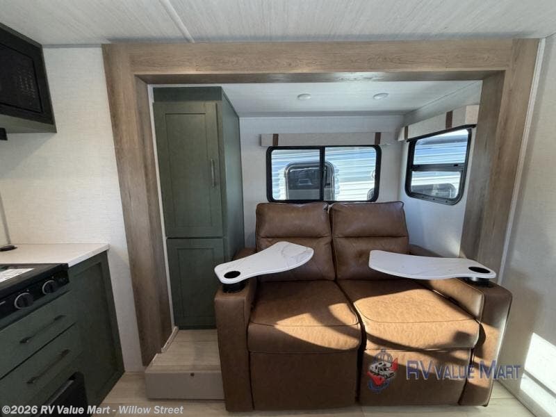 You'll love camping in this couple's trailer! There is a queen bed in the front bedroom, along with dual bedside wardrobes and overhead storage for clothes, books and more. And don't overlook the spacious walk-thru bath! Once you've made breakfast in the rear kitchen or on the outside kitchen, you can dine at the bar top with chairs and a flip-up window. There is also a Trailgate Outdoor Bar if you decide to dine outdoors!