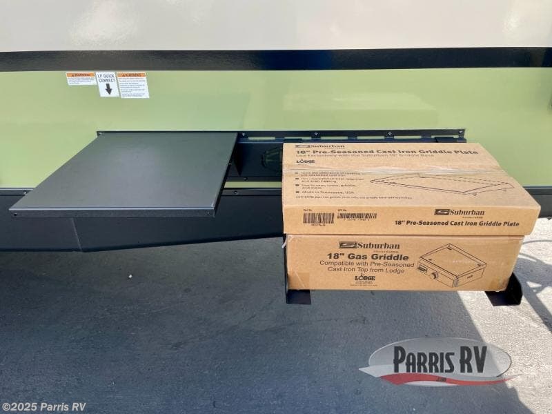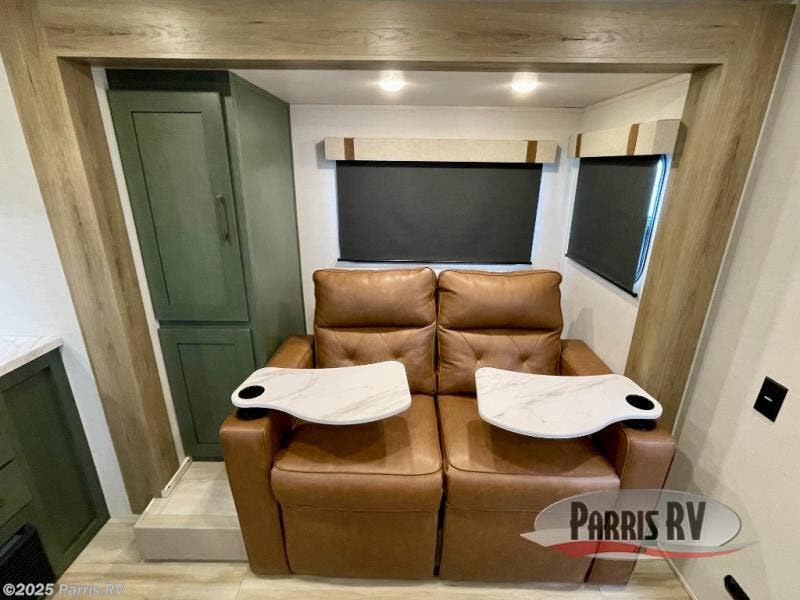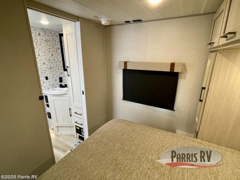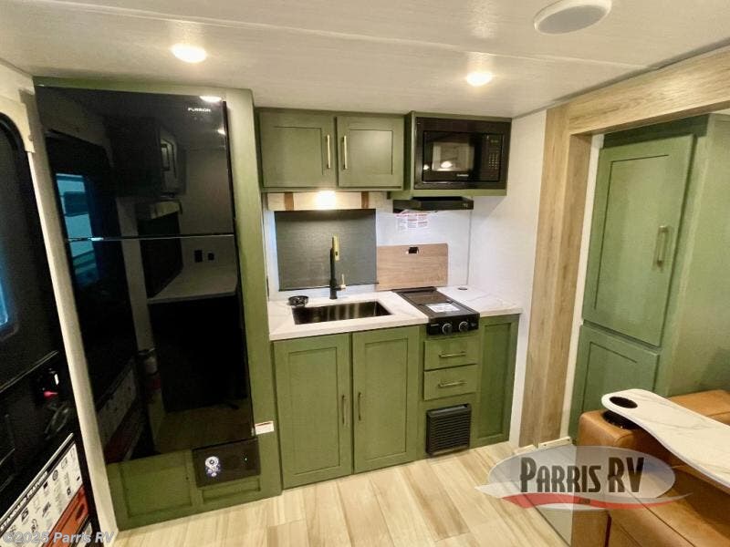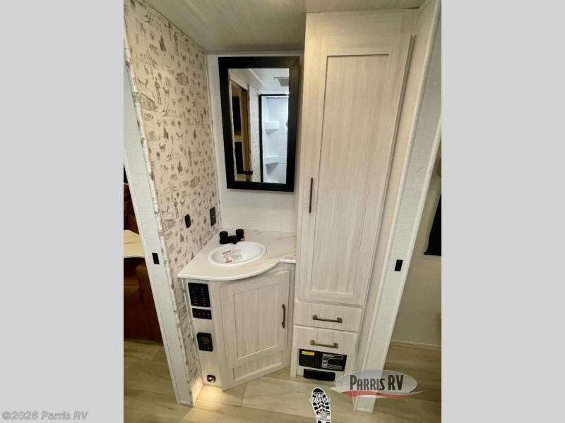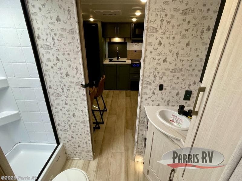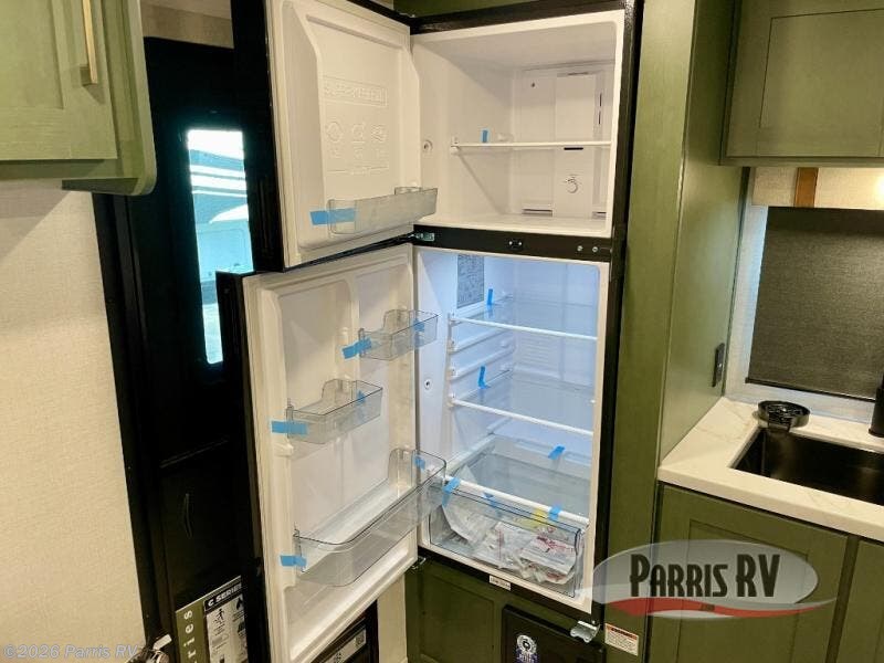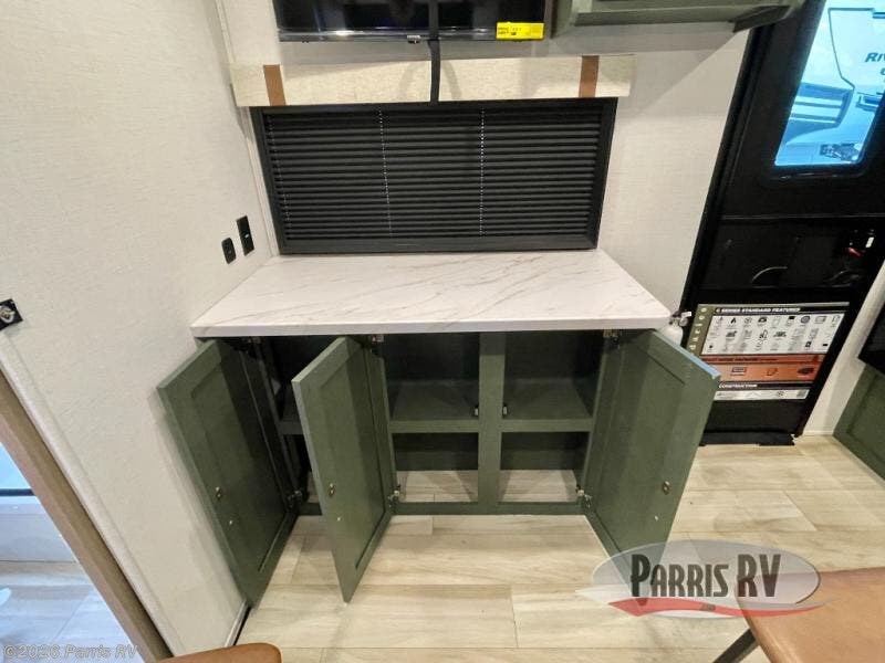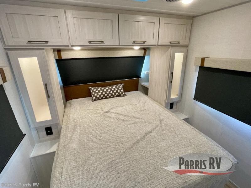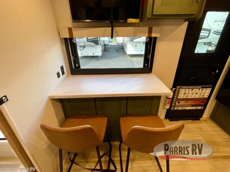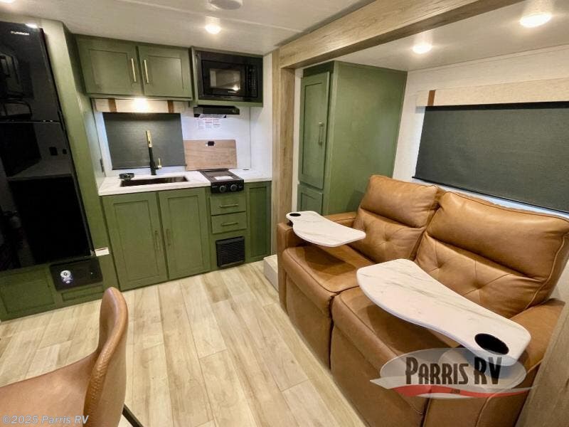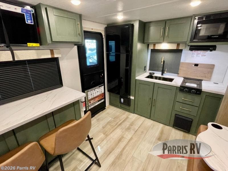 You'll love camping in this couple's trailer! There is a queen bed in the front bedroom, along with dual bedside wardrobes and overhead storage for clothes, books and more. And don't overlook the spacious walk-thru bath! Once you've made breakfast in the rear kitchen or on the outside kitchen, you can dine at the bar top with chairs and a flip-up window. There is also a Trailgate Outdoor Bar if you decide to dine outdoors!
