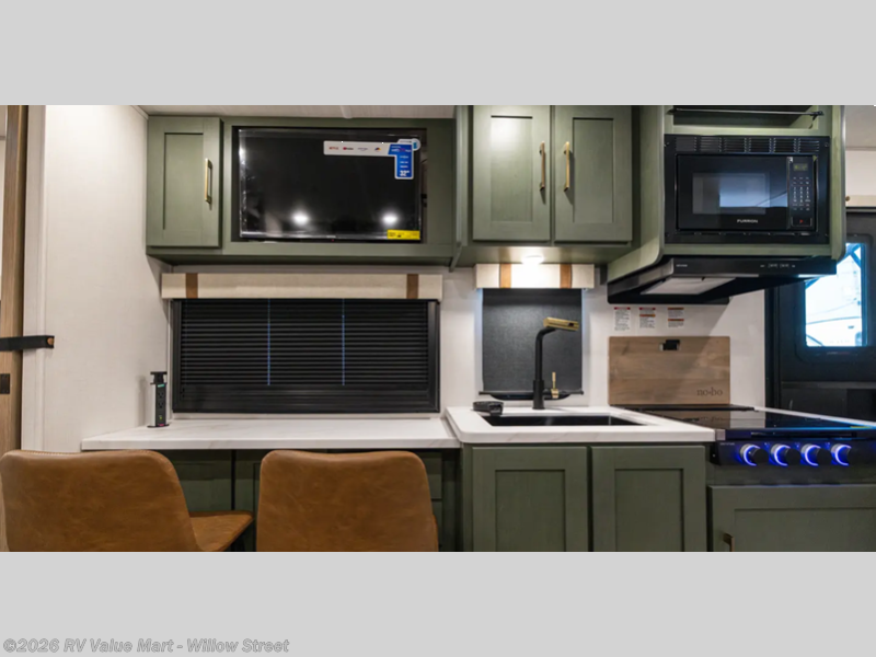You'll love camping in this couple's trailer! There is a queen bed in the front bedroom, along with dual bedside wardrobes and overhead storage for clothes, books and more. Once you've made breakfast in the full kitchen or on the outside kitchen, you can dine at the bar top with chairs and a flip-up window. There is also theater seating to relax in comfort each day! The full bath lets you clean up each day, and you'll love the amount of storage in this trailer, including a walk-in pantry for dry goods, snacks and more. When the optional Beast Mode Package is chosen with this model, you'll find a Beast Mode independent suspension, an additional 200-watt solar panel, a fresh water filter and more!