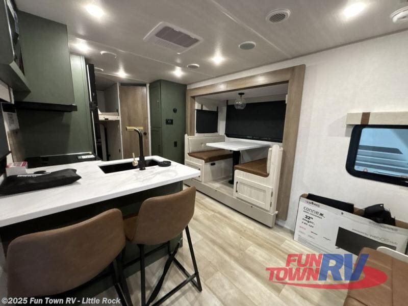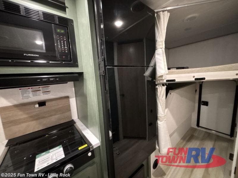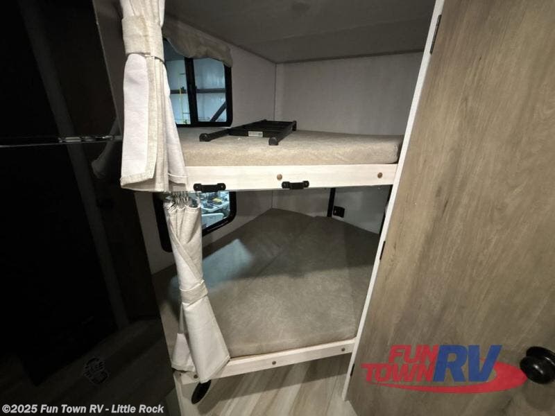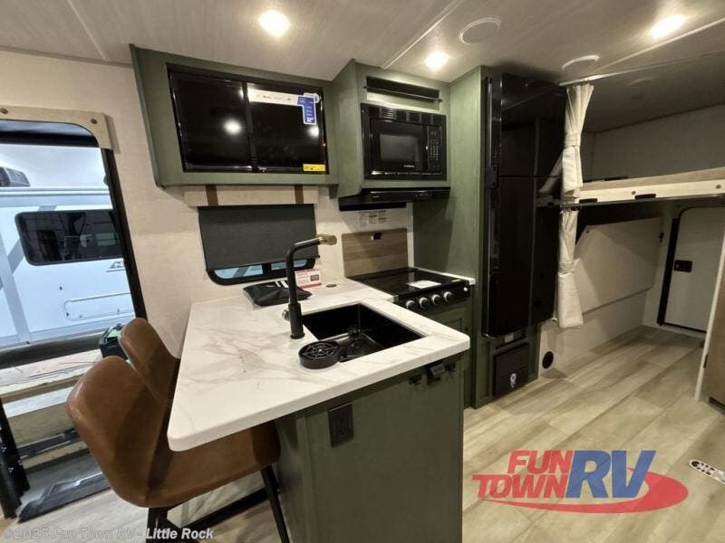 Pack up this very versatile Murphy bed travel trailer and head out to explore! You will love the space saving aspect that a Murphy bed gives you by not increasing the tow length in order to give you a separate bedroom and living space, and you don't even have to make the bed, just fold it up into the wall in the morning! Double-size bunks in the rear corner are perfect for accommodating both children and adults. The kitchen offers everything a cook would need to feed the whole gang and there is even a counter bar area with two stools which will be perfect for breakfast time. There is a booth dinette slide for more dining space, or a place to enjoy a board game or card game when you are inside. When the optional Beast Mode Package on this model is chosen, you'll enjoy a 400-watt solar package, a fresh water filter, a Maxxair roof vent cover, plus a Beast Mode independent suspension for better handling.
