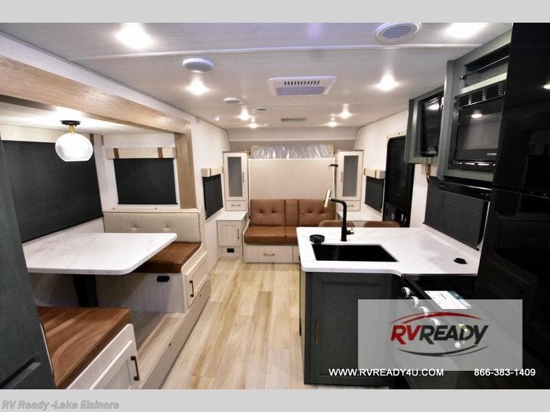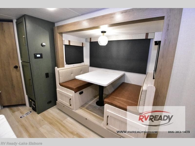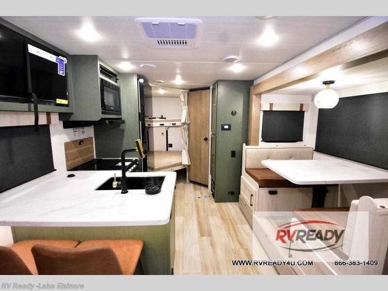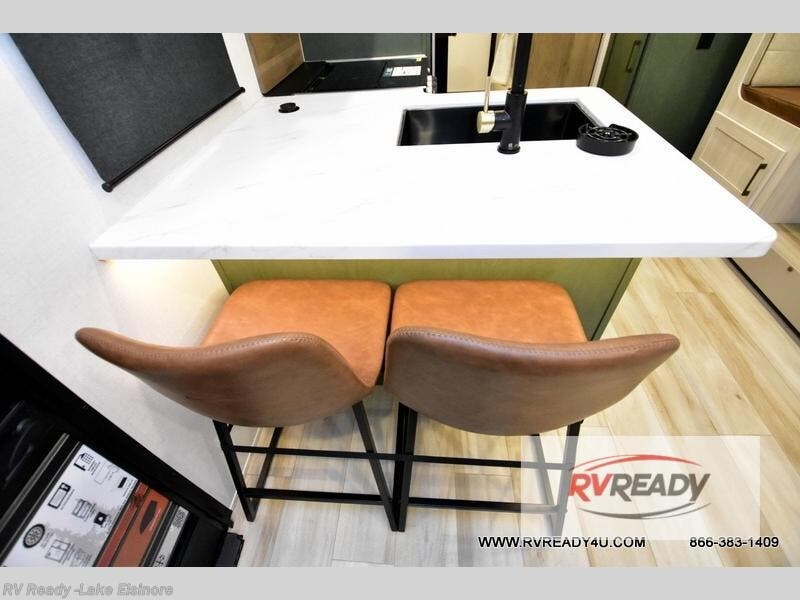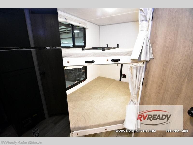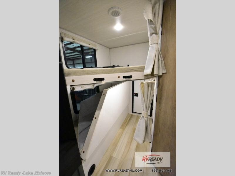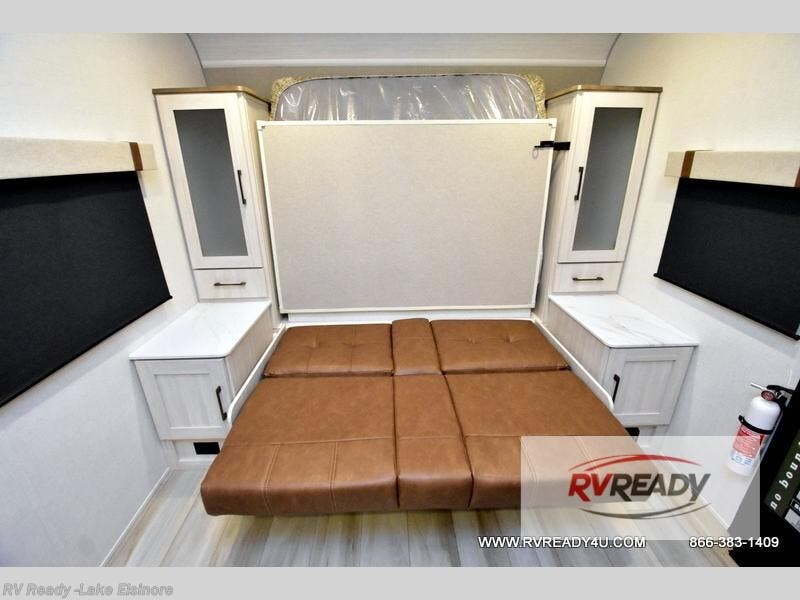 Pack up this very versatile Murphy bed travel trailer and head out to explore! You will love the space saving aspect that a Murphy bed gives you by not increasing the tow length in order to give you a separate bedroom and living space, and you don't even have to make the bed, just fold it up into the wall in the morning! Double-size bunks in the rear corner are perfect for accommodating both children and adults. The kitchen offers everything a cook would need to feed the whole gang and there is even a counter bar area with two stools which will be perfect for breakfast time. There is a booth dinette slide for more dining space, or a place to enjoy a board game or card game when you are inside. When the optional Beast Mode Package on this model is chosen, you'll enjoy a 400-watt solar package, a fresh water filter, a Maxxair roof vent cover, plus a Beast Mode independent suspension for better handling.