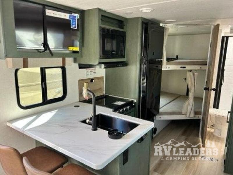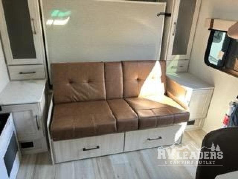 Pack up this very versatile Murphy bed travel trailer and head out to explore! You will love the space saving aspect that a Murphy bed gives you by not increasing the tow length in order to give you a separate bedroom and living space, and you don't even have to make the bed, just fold it up into the wall in the morning! Double-size bunks in the rear corner are perfect for accommodating both children and adults. The kitchen offers everything a cook would need to feed the whole gang and there is even a counter bar area with two stools which will be perfect for breakfast time. There is a booth dinette slide for more dining space, or a place to enjoy a board game or card game when you are inside.
