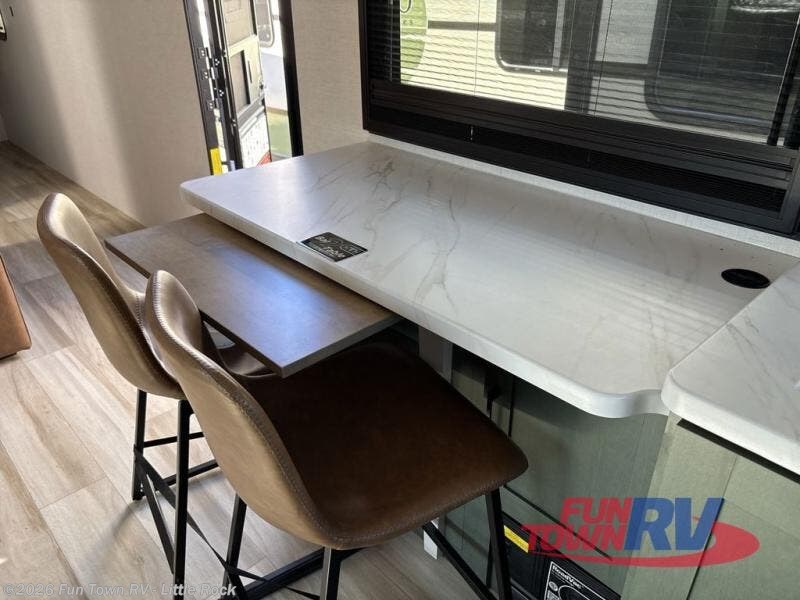 This spacious travel trailer is perfect for weekend trips to the lake. After you've unloaded the pass-through storage and put out the 20' awning, you can make lunch on the outside kitchen. If the weather isn't cooperating, the rear kitchen inside provides all the appliances needed to prepare meals. A Bar 2 Table provides a place to dine together, and there is a flip-up window here to let more light in! Your guests can sleep on the tri-fold sofa, while you take the queen bed in the front private bedroom. This unit also includes a closet with washer and dryer prep if you plan to add these appliances. When the optional Beast Mode Package is chosen on this model, you'll enjoy the Beast Mode suspension, an additional 200-watt solar panel, a Maxxair vent cover and more!