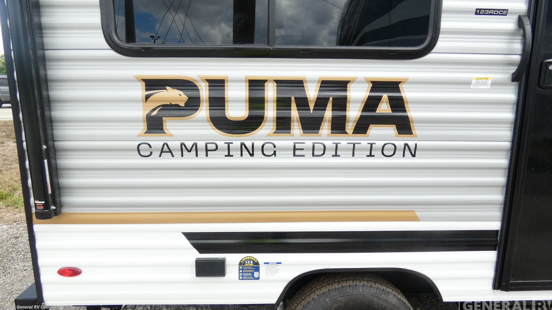 **Forest River Puma Camping Edition travel trailer 123RDCE highlights:** - Rear Corner Bath - Outside Storage - 54" x 74" Queen Bed - Booth Dinette It will be so easy to enjoy camping trips in this single axle travel trailer! There is a front RV queen bed with flip-up storage at the foot of the bed for your belongings, and any additional guests can sleep on the booth dinette with an open shelf above. A full kitchen includes a two-burner cooktop and microwave to cook meals each day, and the 12V black glass refrigerator will keep your food fresh. And a private bath includes a 24" x 32" shower to clean off after a day outdoors! The Puma Camping Edition by Forest River offer an affordable travel trailer for rookie campers or seasoned RVers! They are built with 5/8" tongue and groove plywood flooring and a front diamond plate for added protection. There are also exterior magnetic baggage door latches, back up camera prep, a battery disconnect. Head inside to find Thermofoil countertops with a smooth drop edge, bedroom USB ports and outlets, and pleated shades in the living room.