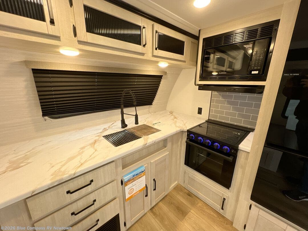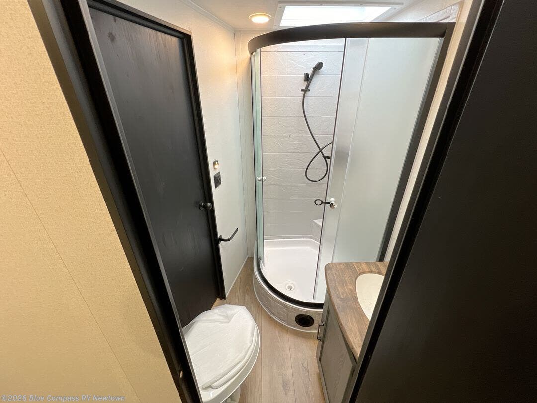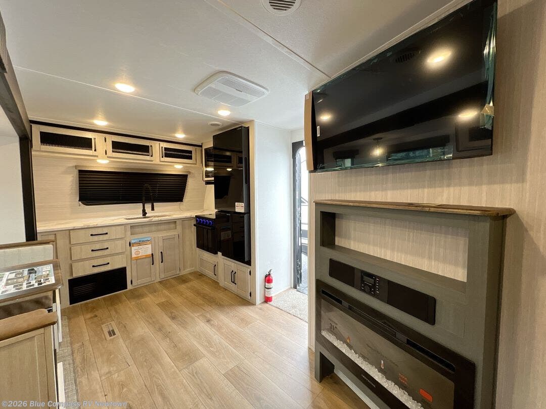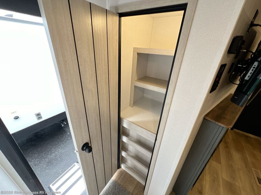 Walk into this travel trailer with one of the dual entry doors for a great camping trip! One entrance enters directly into the rear private bedroom which has a queen bed slide, a walk-in closet with washer and dryer prep, a wardrobe, and even an entrance into the dual entry bathroom. Grab a snack from the walk-in pantry then relax on the sofa while you watch a movie with the entertainment center or play a game at the booth dinette. The front kitchen has everything you will need to prepare your best home cooked meals including lots of countertop space, a stainless steel oven and range, and a stainless steel microwave!