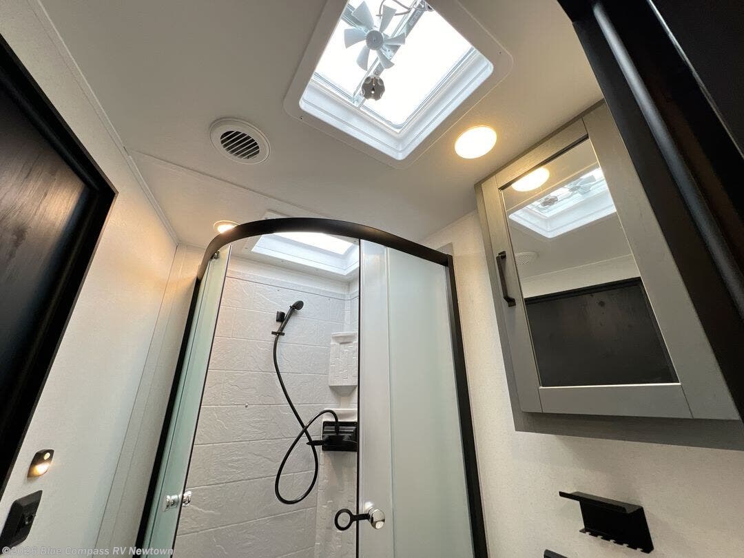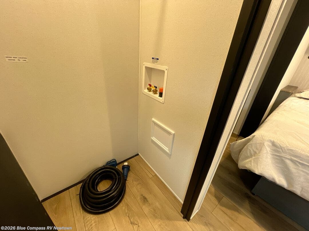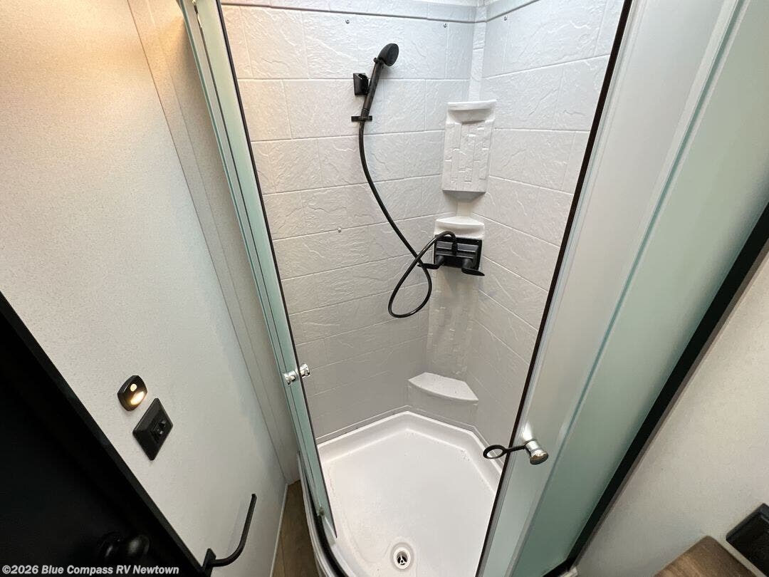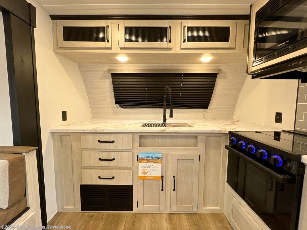Walk into this travel trailer with one of the dual entry doors for a great camping trip! One entrance enters directly into the rear private bedroom which has a queen bed slide, a walk-in closet with washer and dryer prep, a wardrobe, and even an entrance into the dual entry bathroom. Grab a snack from the walk-in pantry then relax on the sofa while you watch a movie with the entertainment center or play a game at the booth dinette. The front kitchen has everything you will need to prepare your best home cooked meals including lots of countertop space, a stainless steel oven and range, and a stainless steel microwave!