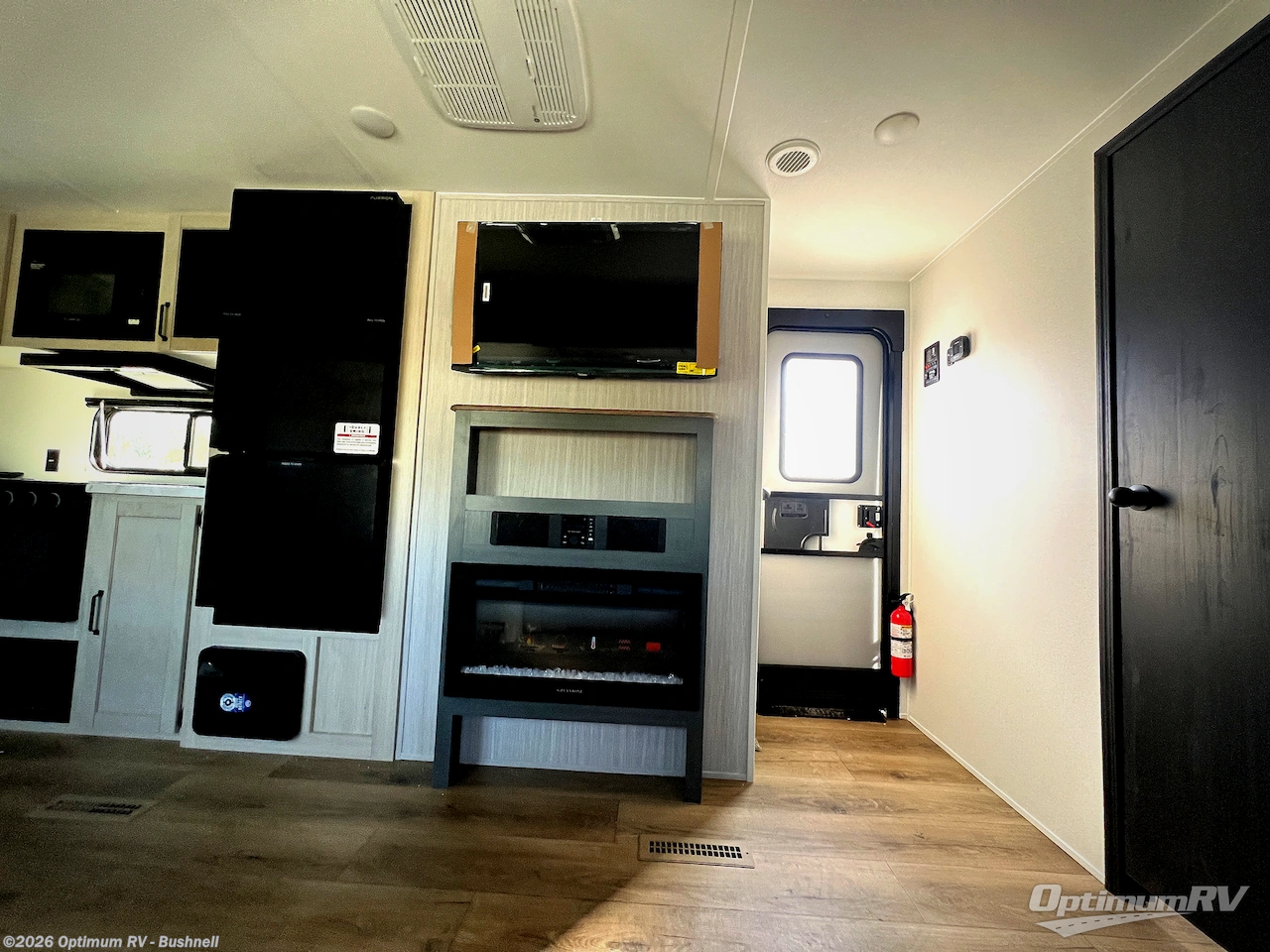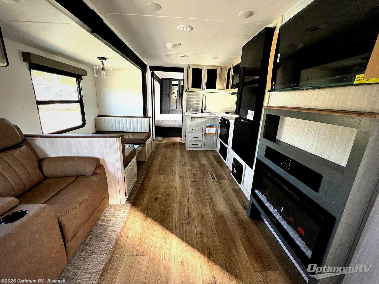 Head to the lake in this double slide out travel trailer that can sleep four to five each night. You will love having the front private bedroom all to yourselves that includes a queen bed slide out, a front wardrobe, a closet with washer and dryer prep, plus your own exterior entry door. Your guests can sleep on the sofa and booth dinette within the second slide out, and the full rear bath is tucked away for privacy. This model also includes an entryway closet/pantry for food storage and jackets, and the fireplace across from the sofa makes your space cozier. An optional outside micro kitchen is available also if you like to cook outdoors!