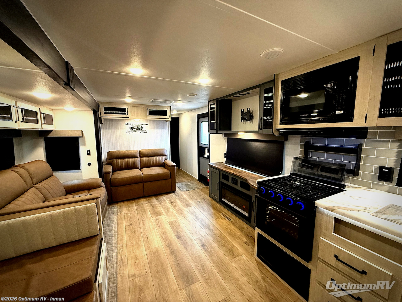 You won't want to camp any other way once you step inside this travel trailer! The rear kitchen has a stainless steel oven and range to prepare your best meals, a 12V refrigerator to keep your perishables fresh, and a walk-in pantry for your canned goods and snacks for movie night. After a fun day at the beach, you can play a card game at the booth dinette, relax in either one of the two recliners and sofa, or rinse the sand out of your hair in the 32" x 40" shower with a seat in the full bathroom. There is also a front private bedroom with a queen bed slide across from a dresser and a front closet with another closet with washer and dryer prep.