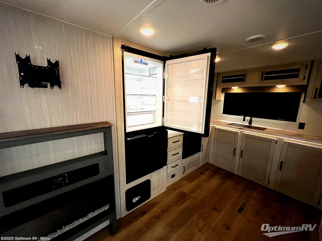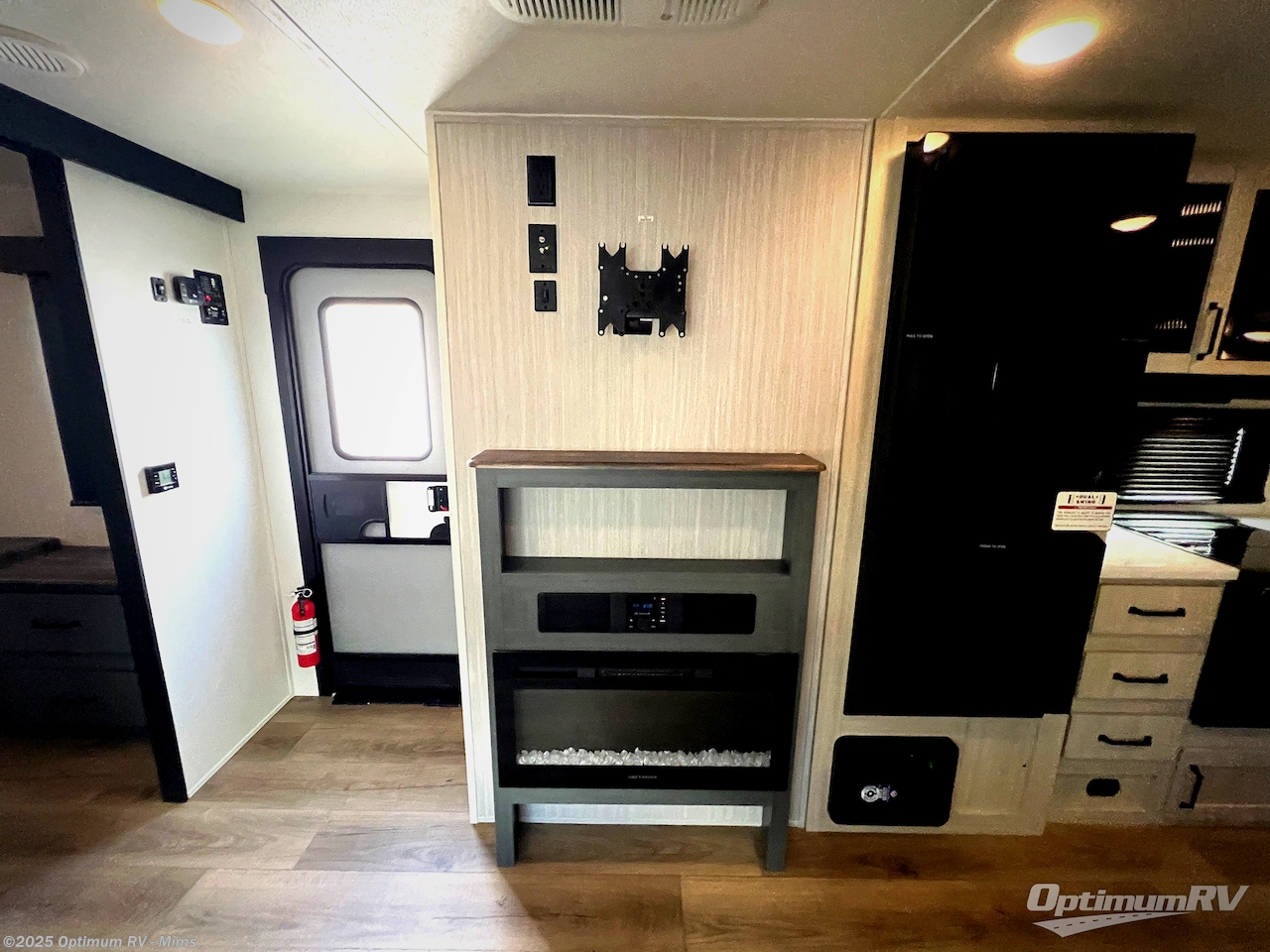 You'll love camping in this double slide out travel trailer with a rear kitchen and a spacious front bath! There is a 40" shower here, along with a linen closet, shirt closet, plus a closet with washer/dryer prep. The master bedroom includes a king bed slide out, dual bedroom dressers, a desk and a TV hookup if you want the option to watch movies in bed. The combined kitchen and living area is made open by the large slide out, which houses the sofa and booth dinette. These pieces of furniture area conveniently across from the entertainment center and fireplace to make it feel more like home. The chef of your group will appreciate generous counter space in the rear kitchen, and if they like to cook outdoors, and optional mini kitchen with a griddle can be added!