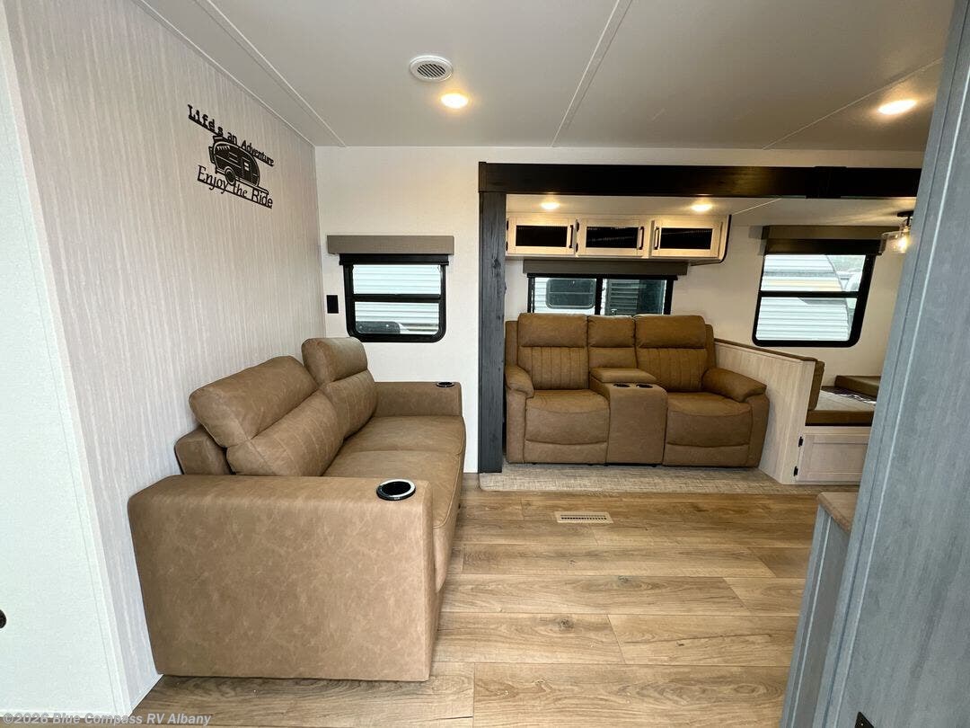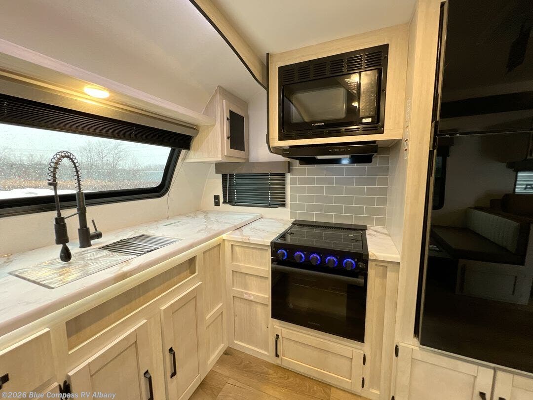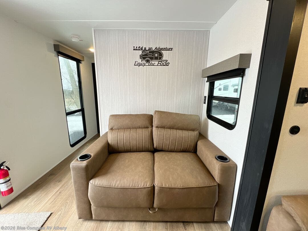 Experience a home away from home with this travel trailer! The front kitchen has everything you will need to prepare your best meals, and you can enjoy them at the booth dinette. The rear private bedroom has a 72" x 80" king bed slide across from a dresser, a wardrobe, and a closet with washer and dryer prep. Freshen up in the full bathroom with the 32" x 40" shower and then enjoy a cup of coffee relaxing on the theater seating or on the sofa! Choose the optional outside micro kitchen with a griddle for even more convenience!